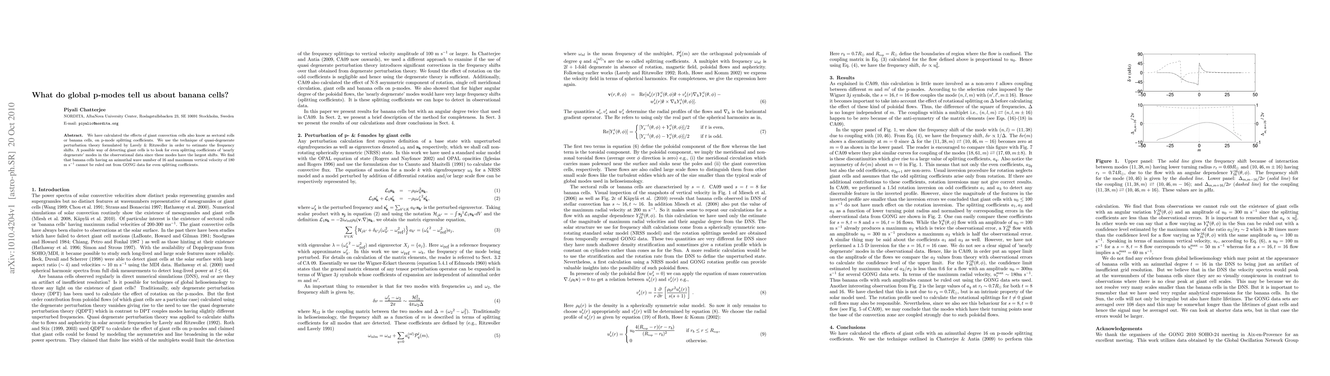 We have calculated the effects of giant convection cells also know as sectoral rolls or banana cells, on p-mode splitting coefficients. We use the technique of quasi-degenerate perturbation theory formulated by Lavely & Ritzwoller in order to estimate the frequency shifts. A possible way of detecting giant cells is to look for even splitting coefficients of 'nearly degenerate' modes in the observational data since these modes have the largest shifts. We find that banana cells having an azimuthal wave number of 16 and maximum vertical velocity of 180 m/s cannot be ruled out from GONG data for even splitting coefficients.