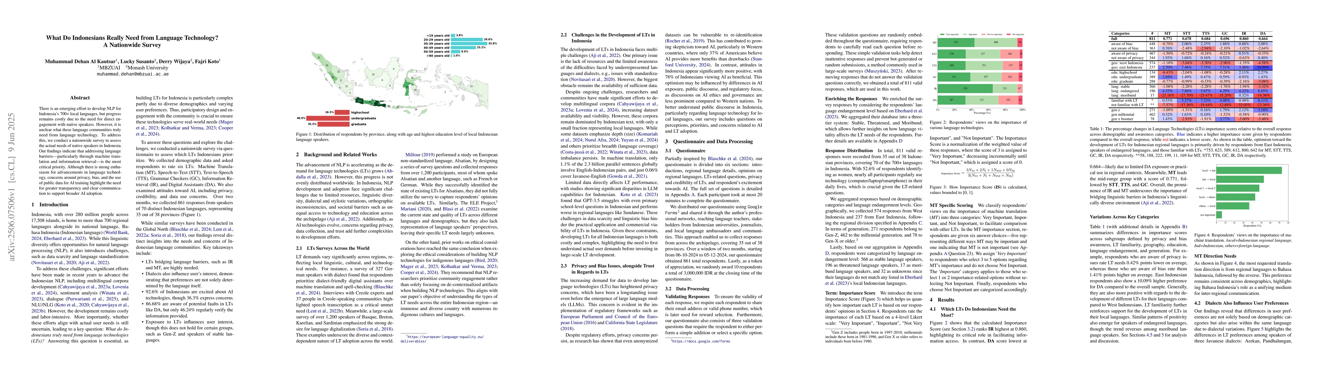 A nationwide survey in Indonesia reveals that native speakers prioritize language technology that reduces communication barriers, especially through machine translation and information access. While there is enthusiasm for technological advances, concerns about privacy and bias highlight the need for transparency to encourage broader adoption.