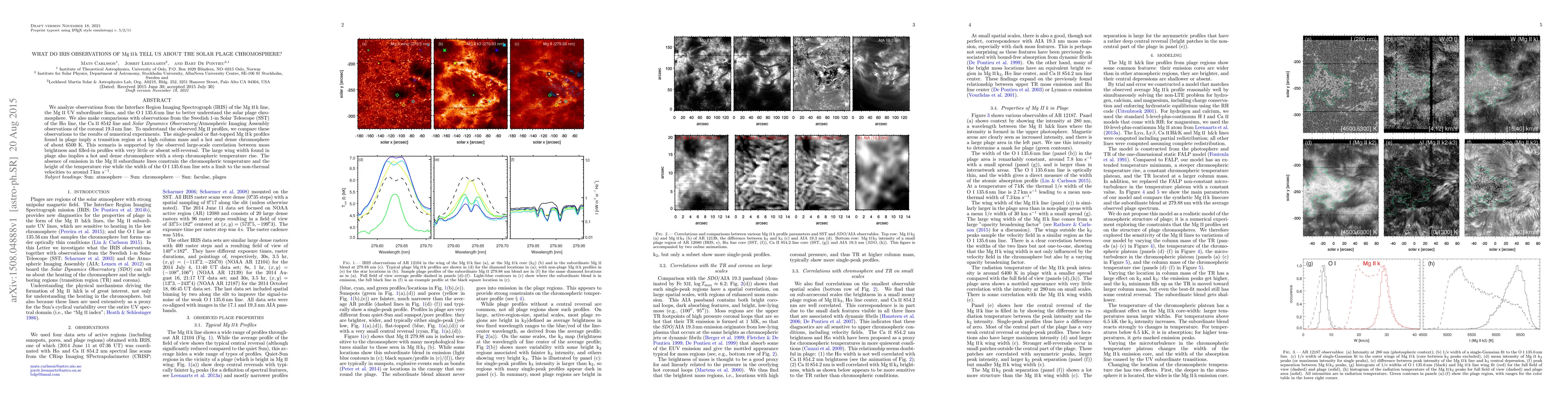 We analyze observations from the Interface Region Imaging Spectrograph of the Mg II k line, the Mg II UV subordinate lines, and the O I 135.6 nm line to better understand the solar plage chromosphere. We also make comparisons with observations from the Swedish 1 m Solar Telescope of the H{\alpha} line, the Ca II 8542 line, and Solar Dynamics Observatory/Atmospheric Imaging Assembly observations of the coronal 19.3 nm line. To understand the observed Mg II profiles, we compare these observations to the results of numerical experiments. The single-peaked or flat-topped Mg II k profiles found in plage imply a transition region at a high column mass and a hot and dense chromosphere of about 6500 K. This scenario is supported by the observed large-scale correlation between moss brightness and filled-in profiles with very little or absent self-reversal. The large wing width found in plage also implies a hot and dense chromosphere with a steep chromospheric temperature rise. The absence of emission in the Mg II subordinate lines constrain the chromospheric temperature and the height of the temperature rise while the width of the O I 135.6 nm line sets a limit to the non-thermal velocities to around 7 km/s.