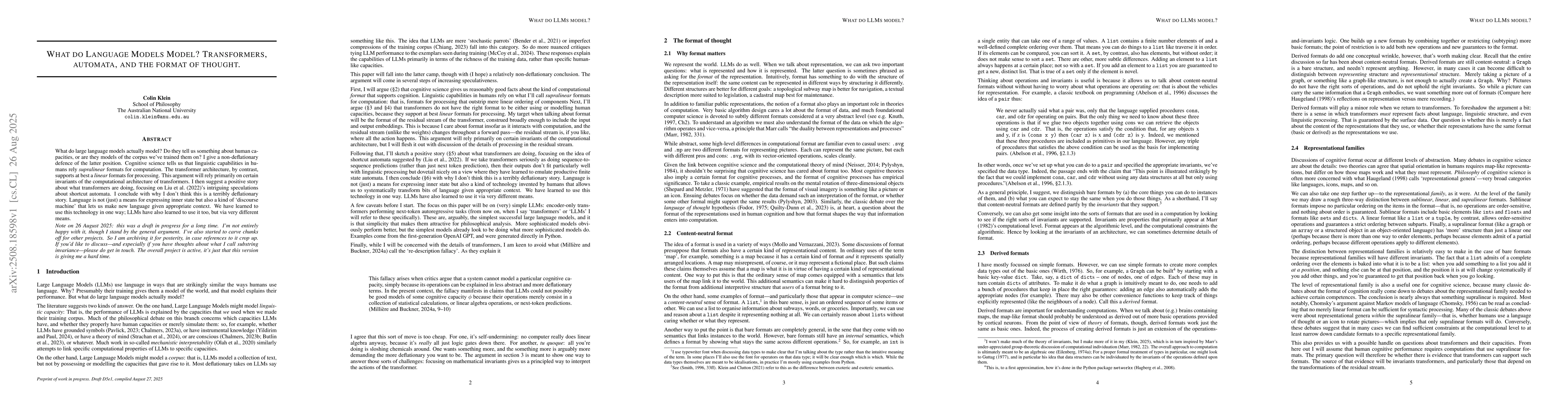 What do large language models actually model? Do they tell us something about human capacities, or are they models of the corpus we've trained them on? I give a non-deflationary defence of the latter position. Cognitive science tells us that linguistic capabilities in humans rely supralinear formats for computation. The transformer architecture, by contrast, supports at best a linear formats for processing. This argument will rely primarily on certain invariants of the computational architecture of transformers. I then suggest a positive story about what transformers are doing, focusing on Liu et al. (2022)'s intriguing speculations about shortcut automata. I conclude with why I don't think this is a terribly deflationary story. Language is not (just) a means for expressing inner state but also a kind of 'discourse machine' that lets us make new language given appropriate context. We have learned to use this technology in one way; LLMs have also learned to use it too, but via very different means.