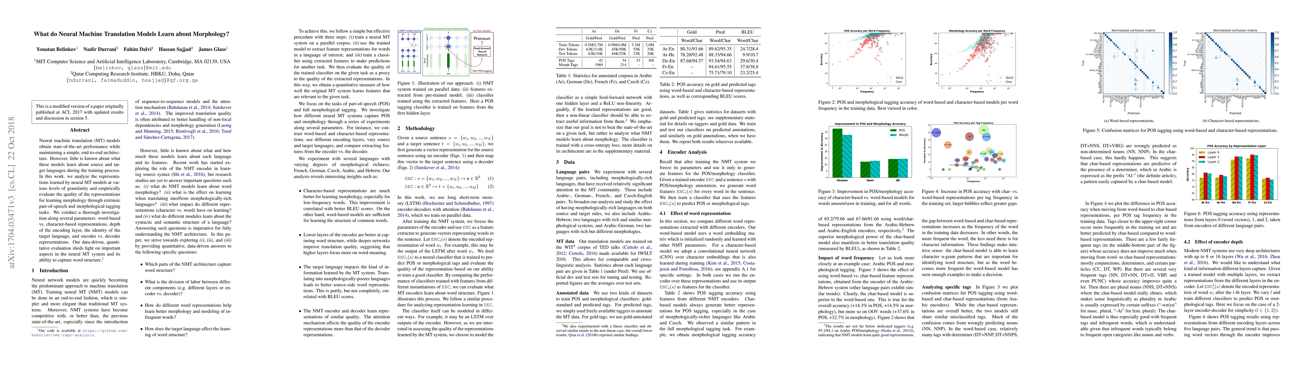 This paper investigates how neural machine translation models learn morphological features by analyzing representations at various levels of granularity and evaluating their effectiveness through part-of-speech and morphological tagging tasks. The study explores factors like word-based vs. character-based representations and the impact of encoding layer depth and target language identity.