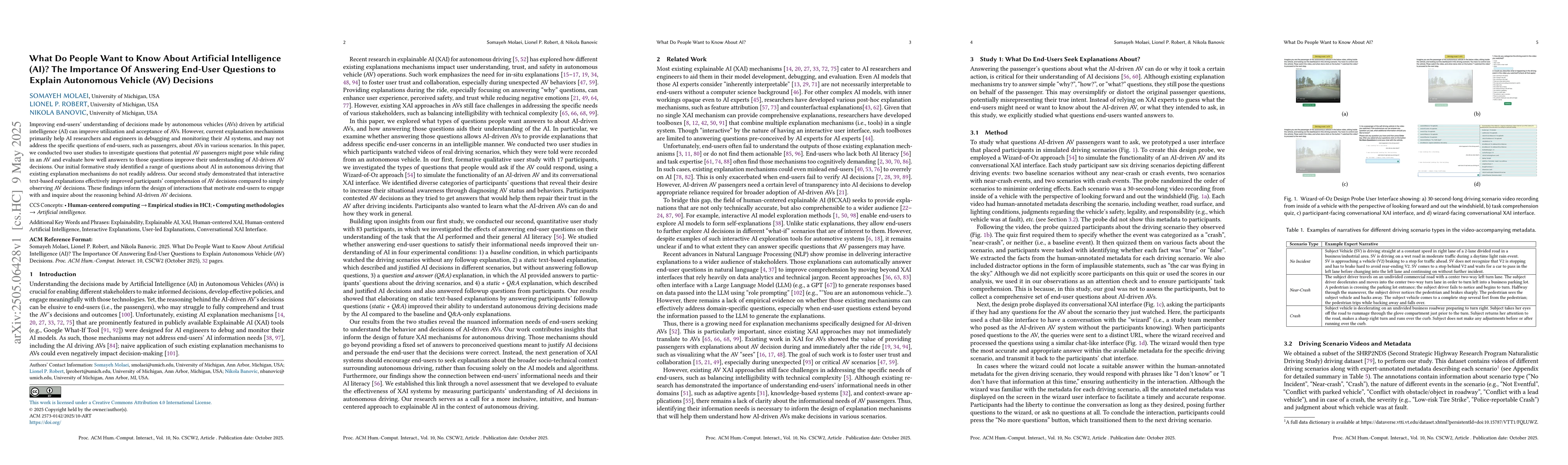 The research employed two user studies to identify questions potential AV passengers might ask and to evaluate the effectiveness of interactive text-based explanations in improving understanding of AV decisions.