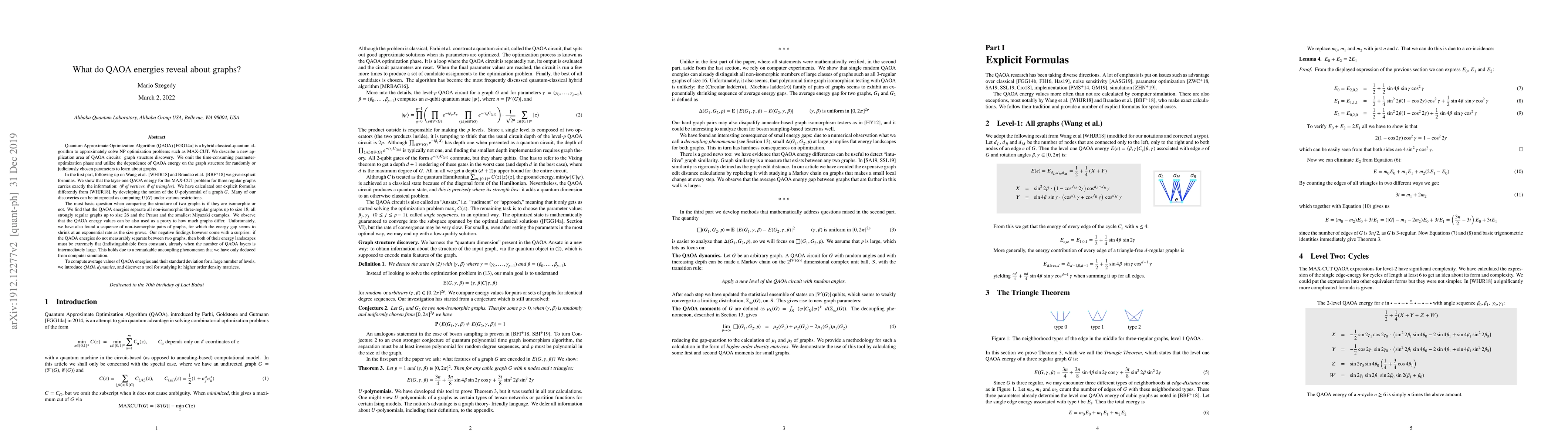 Quantum Approximate Optimization Algorithm (QAOA) is a hybrid classical-quantum algorithm to approximately solve NP optimization problems such as MAX-CUT. We describe a new application area of QAOA circuits: graph structure discovery. We omit the time-consuming parameter-optimization phase and utilize the dependence of QAOA energy on the graph structure for randomly or judiciously chosen parameters to learn about graphs. In the first part, Following up on Wang et. al. and Brandao et. al. we give explicit formulas. We show that the layer-one QAOA energy for the MAX-CUT problem for three regular graphs carries exactly the information: {\em (# of vertices, # of triangles)}. We have calculated our explicit formulas differently from \cite{wang2018quantum}, by developing the notion of the $U$ polynomial of a graph $G$. Many of our discoveries can be interpreted as computing $U(G)$ under various restrictions. The most basic question when comparing the structure of two graphs is if they are isomorphic or not. We find that the QAOA energies separate all non-isomorphic three-regular graphs up to size 18, all strongly regular graphs up to size 26 and the Praust and the smallest Miyazaki examples. We observe that the QAOA energy values can be also used as a proxy to how much graphs differ. Unfortunately, we have also found a sequence of non-isomorphic pairs of graphs, for which the energy gap seems to shrink at an exponential rate as the size grows. Our negative findings however come with a surprise: if the QAOA energies do not measurably separate between two graphs, then both of their energy landscapes must be extremely flat (indistinguishable from constant), already when the number of QAOA layers is intermediately large. This holds due to a remarkable uncoupling phenomenon that we have only deduced from computer simulation.