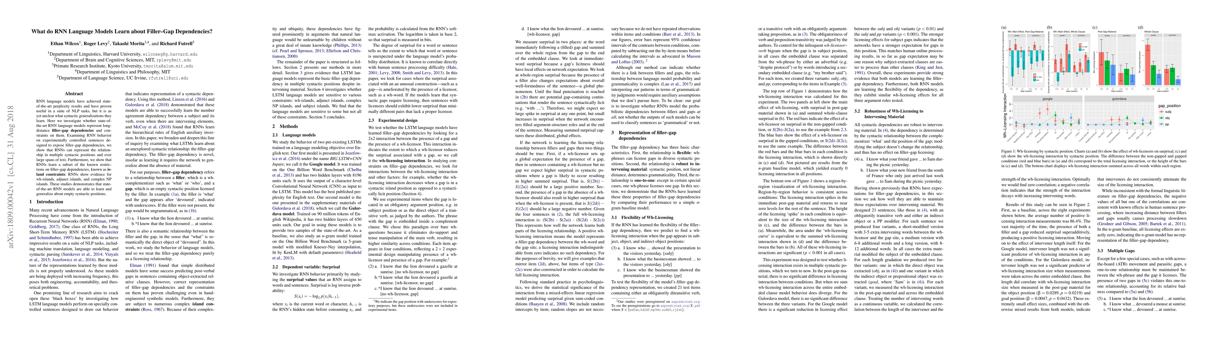 This paper investigates whether RNN language models can represent long-distance filler-gap dependencies and island constraints. The study finds that RNNs can learn and generalize about these syntactic structures, showing evidence for wh-islands, adjunct islands, and complex NP islands.