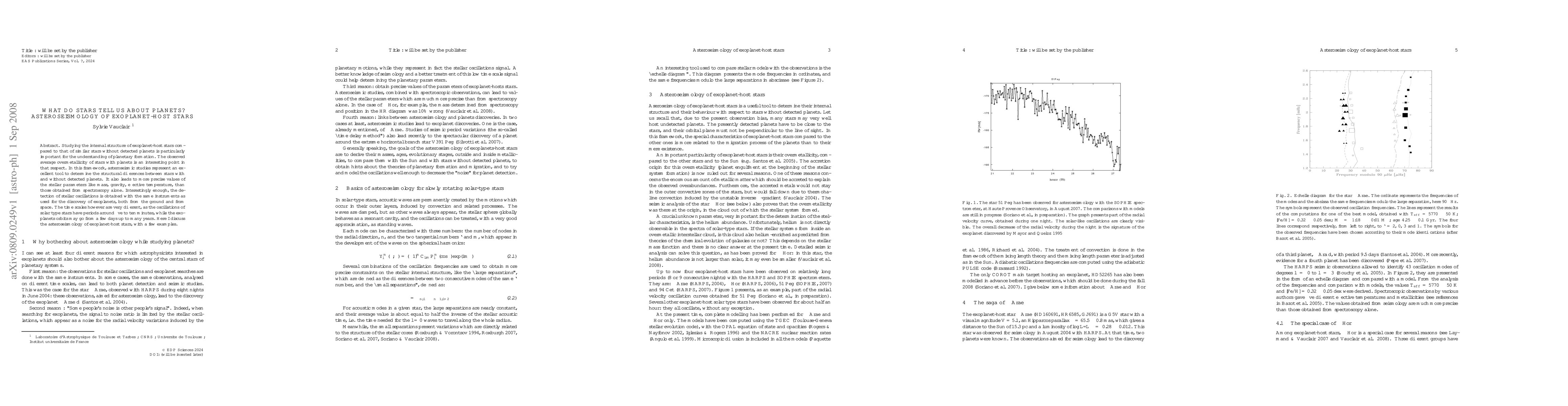 Asteroseismology of exoplanet-host stars reveals structural differences and provides precise stellar parameter values, like mass, gravity, and effective temperature, compared to similar star counterparts without planets. This method utilizes the same instruments used for exoplanet discovery, with oscillation periods around five to ten minutes, contrasting with exoplanet orbital periods ranging from days to years.