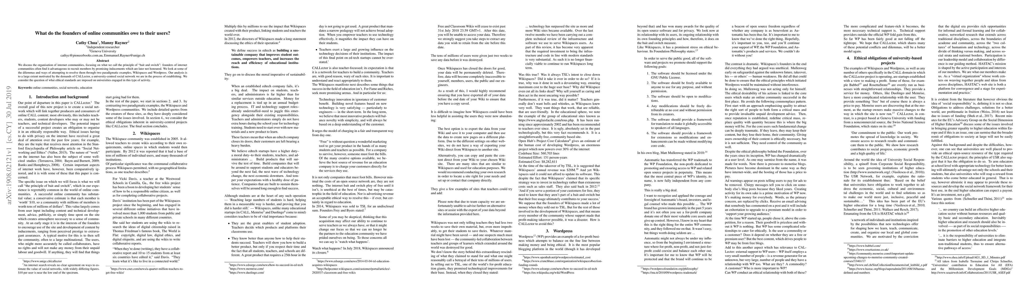 We discuss the organisation of internet communities, focusing on what we call the principle of "bait and switch": founders of internet communities often find it advantageous to recruit members by promising inducements which are later not honoured. We look at some of the dilemmas and ways of attempting to resolve them through two paradigmatic examples, Wikispaces and Wordpress. Our analysis is to a large extent motivated by the demands of CALLector, a university-centred social network we are in the process of establishing. We consider the question of what ethical standards are imposed on universities engaged in this type of activity.