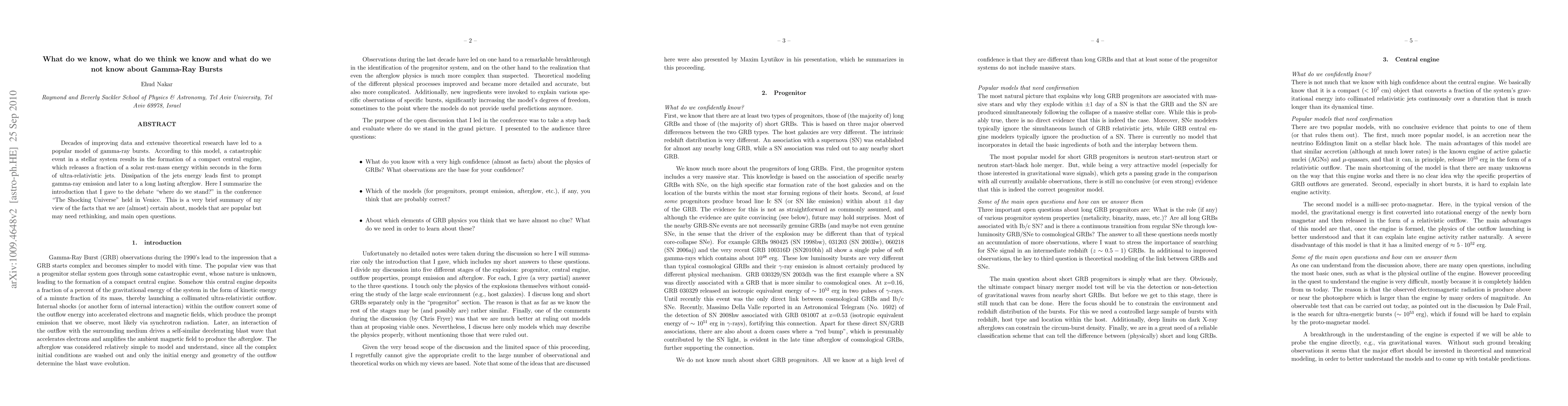 Decades of improving data and extensive theoretical research have led to a popular model of gamma-ray bursts. According to this model, a catastrophic event in a stellar system results in the formation of a compact central engine, which releases a fraction of a solar rest-mass energy within seconds in the form of ultra-relativistic jets. Dissipation of the jets energy leads first to prompt gamma-ray emission and later to a long lasting afterglow. Here I summarize the introduction that I gave to the debate "where do we stand?" in the conference "The Shocking Universe" held in Venice. This is a very brief summary of my view of the facts that we are (almost) certain about, models that are popular but may need rethinking, and main open questions.