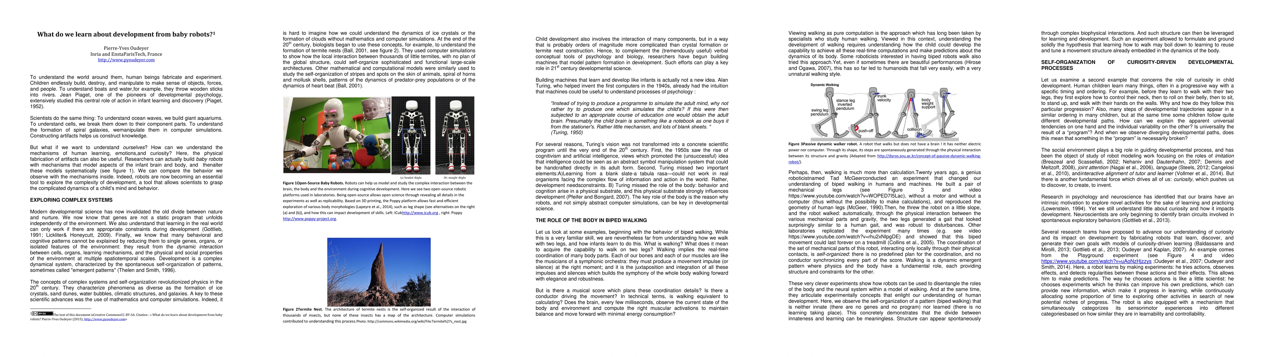 This research highlights how building and experimenting with baby-like robots helps scientists understand infant development as a complex, interactive process influenced by physical and environmental factors. Using robotic models allows for systematic testing of development mechanisms beyond traditional psychological methods.