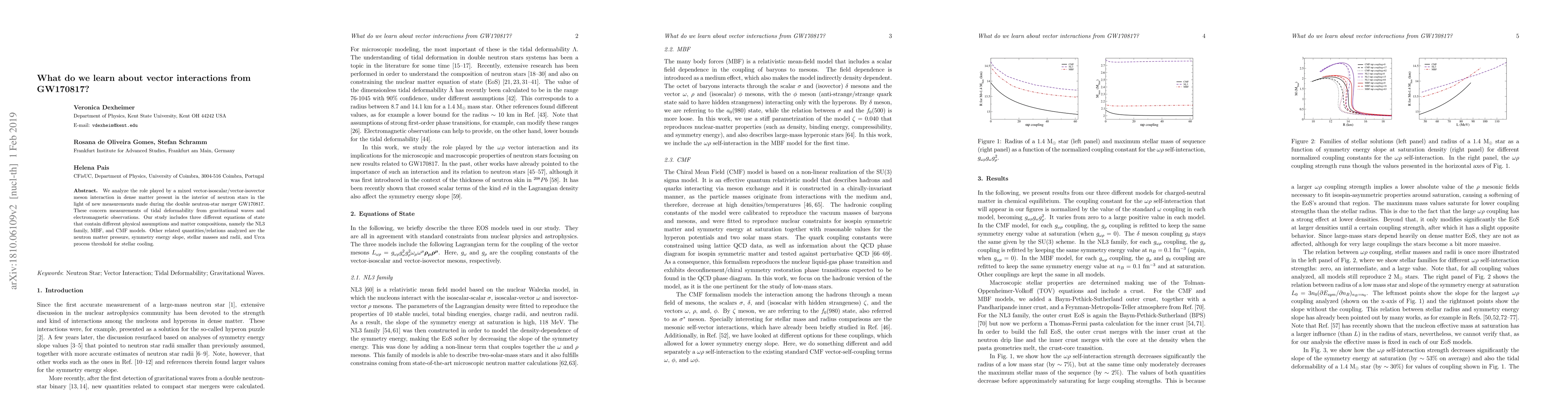 We analyze the role played by vector-isovector meson interaction in dense matter present in the interior of neutron stars in the light of new measurements made during the double neutron-star merger GW170817. These concern measurements of tidal deformability from gravitational waves and electromagnetic observations. Our study includes three different equations of state that contain different physical assumptions and matter compositions, namely the NL3 family, MBF, and CMF models. Other related quantities/relations analyzed are the neutron matter pressure, symmetry energy slope, stellar masses and radii, and Urca process threshold for stellar cooling.