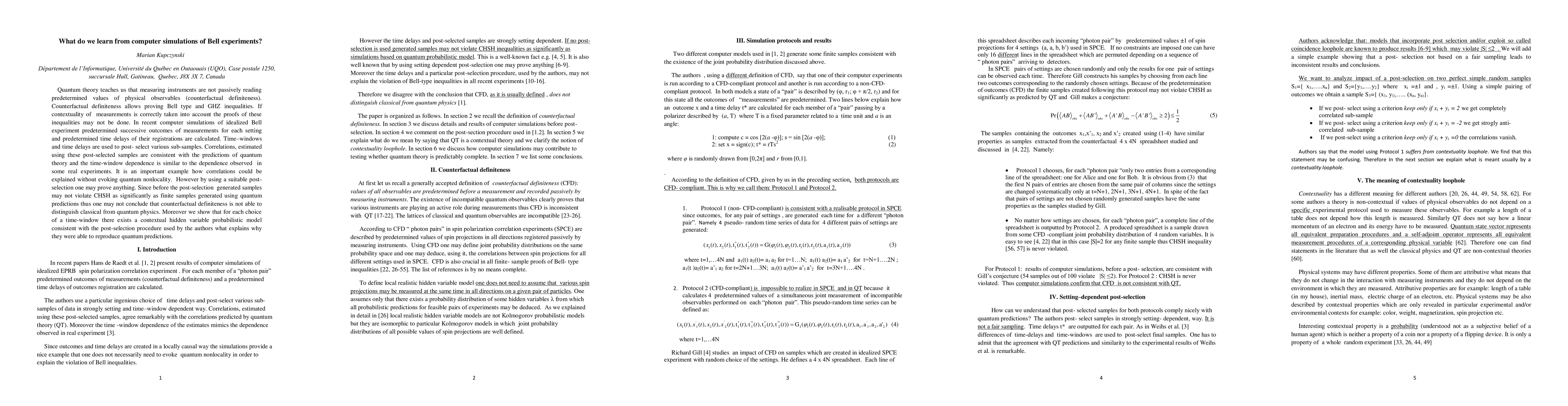 This paper discusses computer simulations of Bell experiments, showing that correlations consistent with quantum theory can be explained without invoking quantum non-locality. However, it argues that the simulations do not conclusively prove counterfactual definiteness cannot distinguish classical from quantum physics due to the potential for post-selection bias.