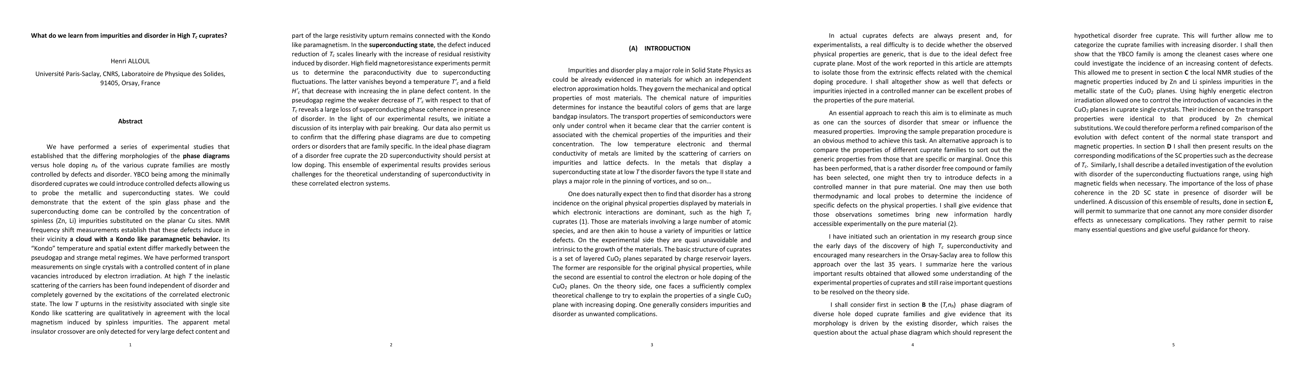 We established that the morphology of the phase diagrams is mostly governed by disorder in the various cuprate families. In the minimally disordered YBCO substitutions of Zn or Li spinless impurities on the planar Cu sites control the extent of the spin glass phase and superconducting (SC) dome. NMR data establish that these defects induce in their vicinity a cloud with a Kondo like paramagnetic behavior that differs markedly between the pseudogap and strange metal regimes. We have studied the evolution of transport properties with disorder by introduction of a controlled content of in plane vacancies by electron irradiation. At high T the inelastic scattering of the carriers is surprisingly disorder independent, and governed by the excitations of the correlated electronic state. The low T upturns of the resistivity, that are associated with single impurity Kondo like scattering, agree qualitatively with the local magnetism induced by spinless impurities. Very large defect contents are required to induce Metal Insulator Crossovers. In the SC state, the defect induced reduction of Tc scales quasi linearly with residual resistivity. The paraconductivity due to SC fluctuations, deduced from high field magnetoresistance measurements vanishes beyond a temperature T//c and a field H//c that decrease with increasing defect content. In the pseudogap regime the weaker decrease of T//c with respect to that of Tc reveals a loss of SC phase coherence in presence of disorder. This initiates a discussion of its interplay with pair breaking and allows us to confirm that the family specific dopant induced disorder or order controls the phase diagram. In the ideal disorder free cuprate the 2D SC state would certainly persist at low doping. This ensemble of data provides serious challenges for the theoretical understanding of superconductivity and the normal state in these SC correlated electron systems.