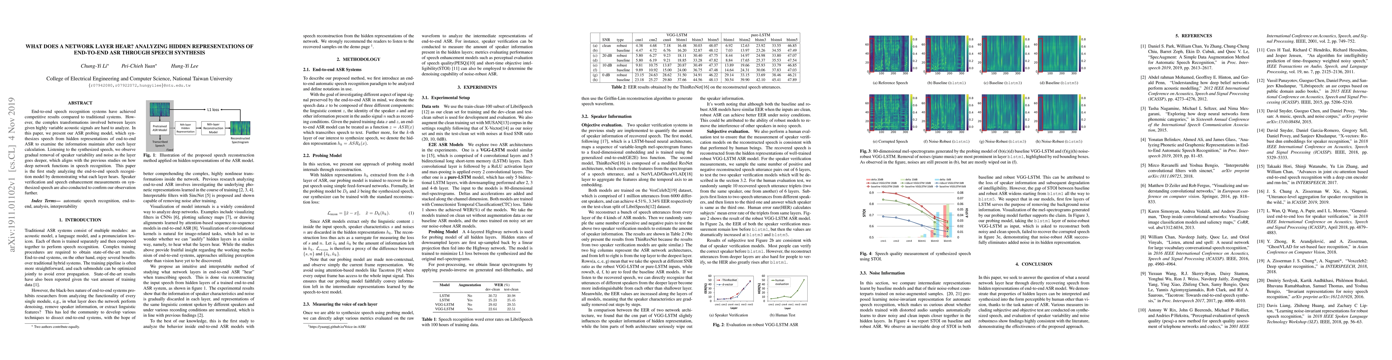 End-to-end speech recognition systems have achieved competitive results compared to traditional systems. However, the complex transformations involved between layers given highly variable acoustic signals are hard to analyze. In this paper, we present our ASR probing model, which synthesizes speech from hidden representations of end-to-end ASR to examine the information maintain after each layer calculation. Listening to the synthesized speech, we observe gradual removal of speaker variability and noise as the layer goes deeper, which aligns with the previous studies on how deep network functions in speech recognition. This paper is the first study analyzing the end-to-end speech recognition model by demonstrating what each layer hears. Speaker verification and speech enhancement measurements on synthesized speech are also conducted to confirm our observation further.