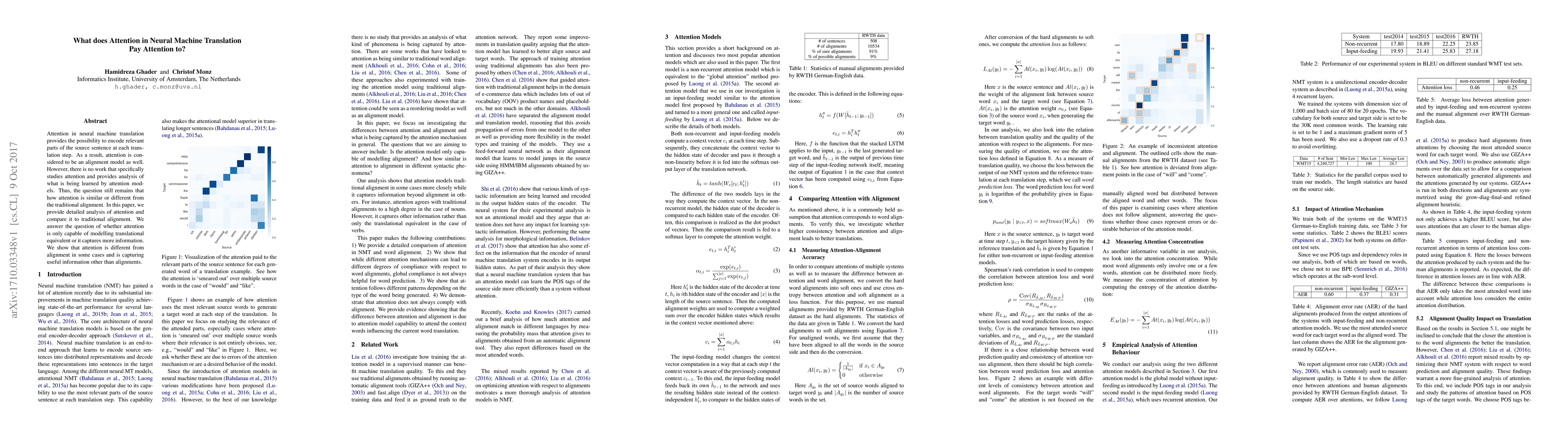 This paper analyzes how attention mechanisms in neural machine translation differ from traditional alignment models, demonstrating that attention captures not only translational equivalents but also additional useful information beyond simple alignments.
