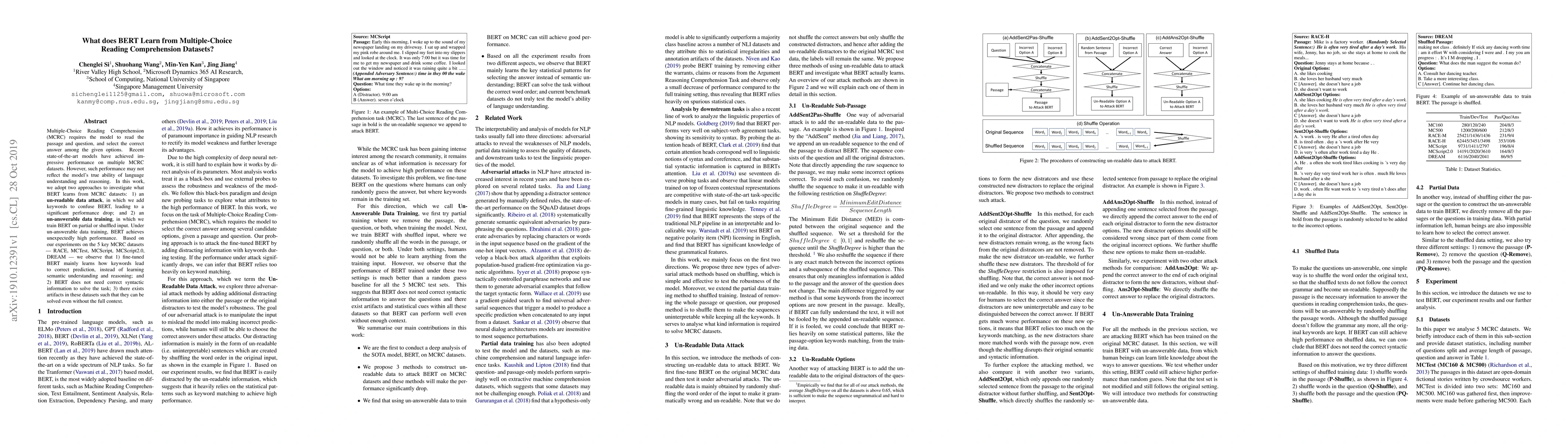 Summary: This study examines what BERT learns from multiple-choice reading comprehension datasets, finding that fine-tuned BERT primarily learns to associate keywords with correct answers rather than true semantic understanding. It also reveals that BERT can achieve high performance even without syntactic information or complete context due to dataset artifacts.