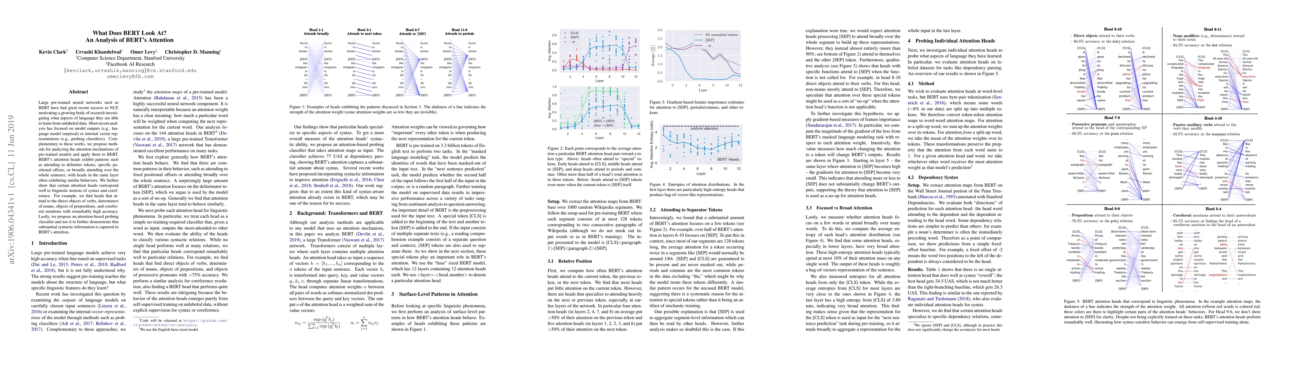Large pre-trained neural networks such as BERT have had great recent success in NLP, motivating a growing body of research investigating what aspects of language they are able to learn from unlabeled data. Most recent analysis has focused on model outputs (e.g., language model surprisal) or internal vector representations (e.g., probing classifiers). Complementary to these works, we propose methods for analyzing the attention mechanisms of pre-trained models and apply them to BERT. BERT's attention heads exhibit patterns such as attending to delimiter tokens, specific positional offsets, or broadly attending over the whole sentence, with heads in the same layer often exhibiting similar behaviors. We further show that certain attention heads correspond well to linguistic notions of syntax and coreference. For example, we find heads that attend to the direct objects of verbs, determiners of nouns, objects of prepositions, and coreferent mentions with remarkably high accuracy. Lastly, we propose an attention-based probing classifier and use it to further demonstrate that substantial syntactic information is captured in BERT's attention.