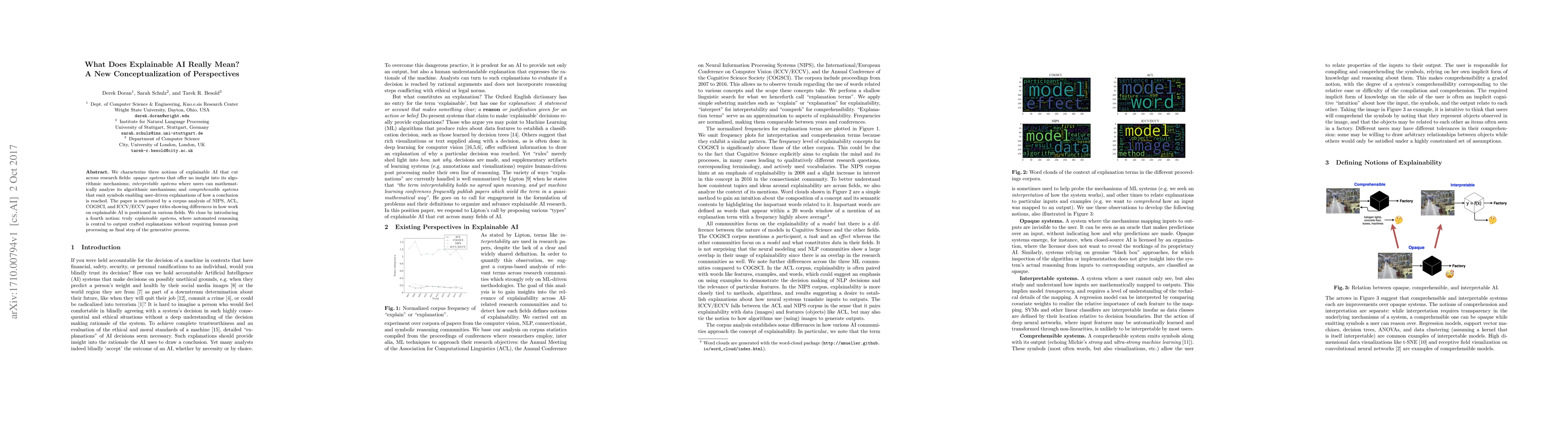 We characterize three notions of explainable AI that cut across research fields: opaque systems that offer no insight into its algo- rithmic mechanisms; interpretable systems where users can mathemat- ically analyze its algorithmic mechanisms; and comprehensible systems that emit symbols enabling user-driven explanations of how a conclusion is reached. The paper is motivated by a corpus analysis of NIPS, ACL, COGSCI, and ICCV/ECCV paper titles showing differences in how work on explainable AI is positioned in various fields. We close by introducing a fourth notion: truly explainable systems, where automated reasoning is central to output crafted explanations without requiring human post processing as final step of the generative process.