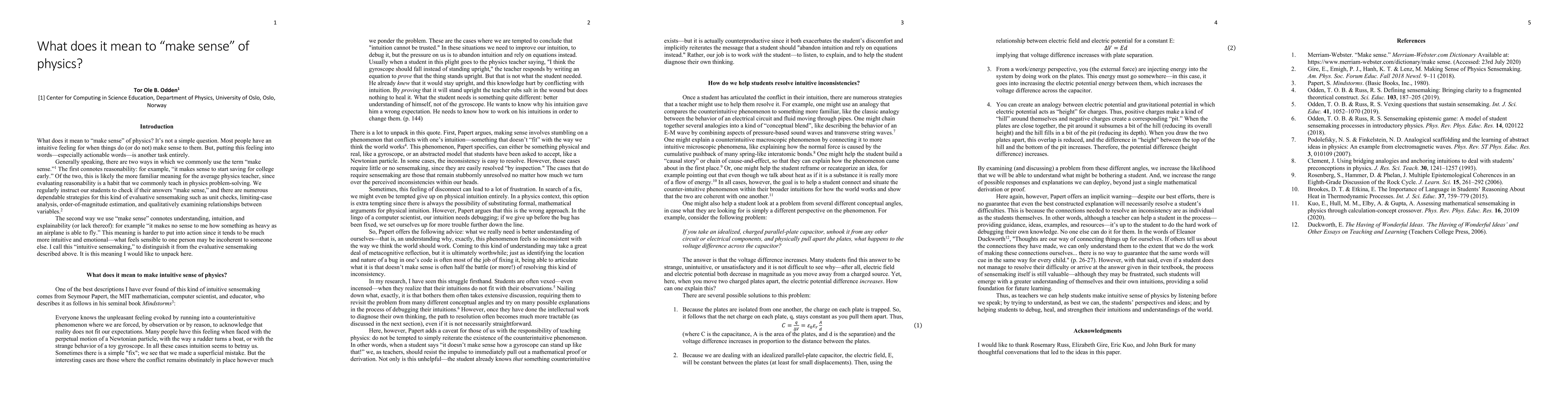 What does it mean to "make sense" of physics? It's not a simple question. Most people have an intuitive feeling for when things do (or do not) make sense to them. But, putting this feeling into words--especially actionable words--is another task entirely.