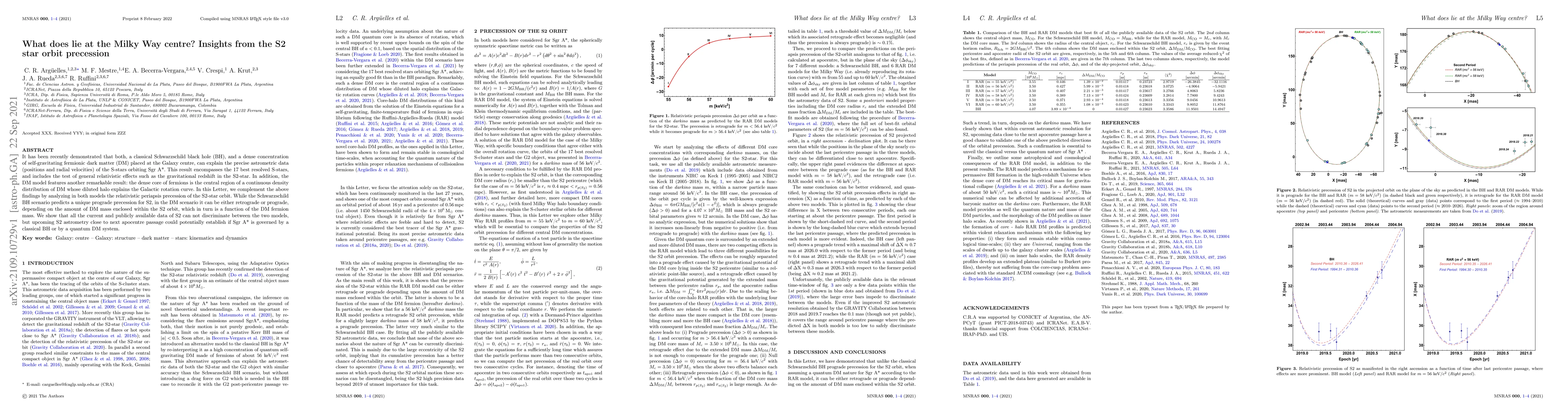 This paper investigates the Milky Way's galactic center using the S2 star's orbit, finding that both a Schwarzschild black hole and a dense fermionic dark matter concentration can explain the observed astrometric data. Upcoming precise astrometry may distinguish between these models based on the relativistic periapsis precession of the S2 orbit.