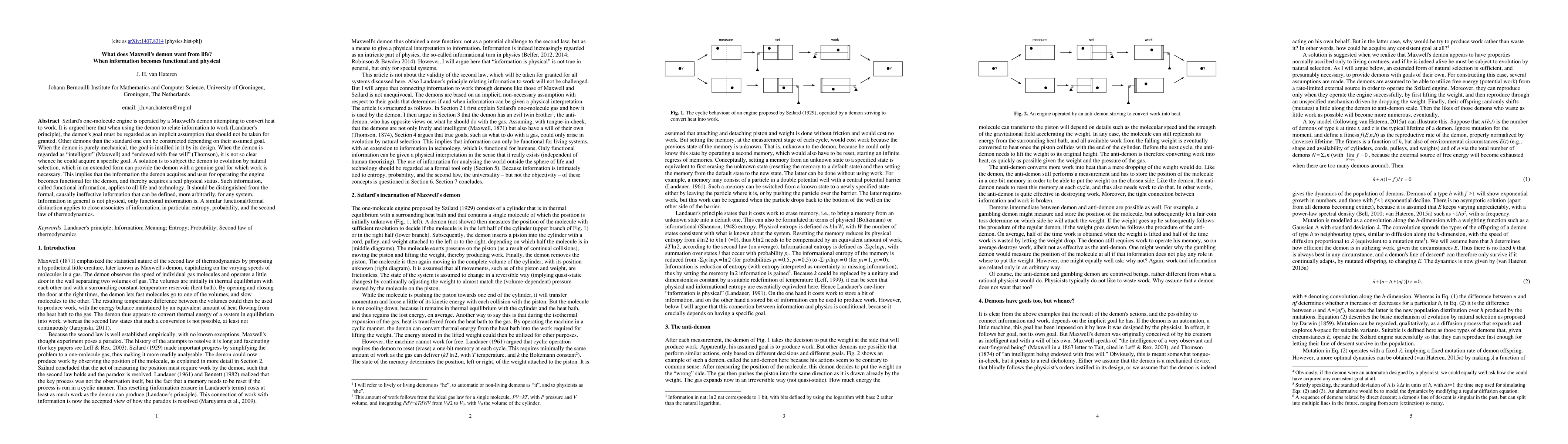 Szilard's one-molecule engine is operated by a Maxwell's demon attempting to convert heat to work. It is argued here that when using the demon to relate information to work (Landauer's principle), the demon's goal must be regarded as an implicit assumption that should not be taken for granted. Other demons than the standard one can be constructed depending on their assumed goal. When the demon is purely mechanical, the goal is instilled in it by its design. When the demon is regarded as "intelligent" (Maxwell) and "endowed with free will" (Thomson), it is not so clear whence he could acquire a specific goal. A solution is to subject the demon to evolution by natural selection, which in an extended form can provide the demon with a genuine goal for which work is necessary. This implies that the information the demon acquires and uses for operating the engine becomes functional for the demon, and thereby acquires a real physical status. Such information, called functional information, applies to all life and technology. It should be distinguished from the formal, causally ineffective information that can be defined, more arbitrarily, for any system. Information in general is not physical, only functional information is. A similar functional/formal distinction applies to close associates of information, in particular entropy, probability, and the second law of thermodynamics.
