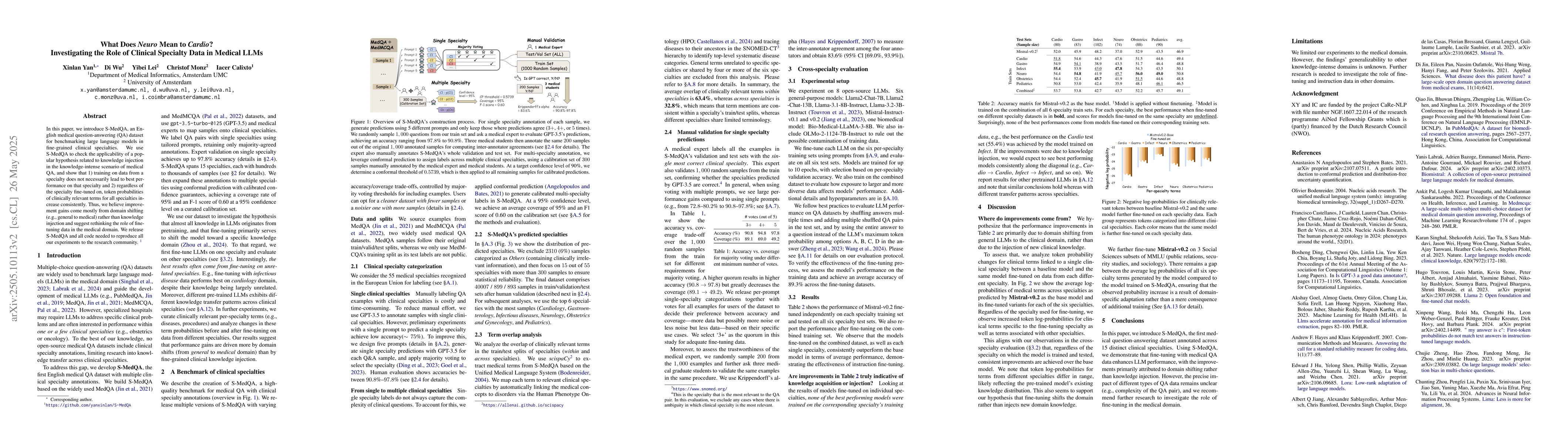 In this paper, we introduce S-MedQA, an English medical question-answering (QA) dataset for benchmarking large language models in fine-grained clinical specialties. We use S-MedQA to check the applicability of a popular hypothesis related to knowledge injection in the knowledge-intense scenario of medical QA, and show that: 1) training on data from a speciality does not necessarily lead to best performance on that specialty and 2) regardless of the specialty fine-tuned on, token probabilities of clinically relevant terms for all specialties increase consistently. Thus, we believe improvement gains come mostly from domain shifting (e.g., general to medical) rather than knowledge injection and suggest rethinking the role of fine-tuning data in the medical domain. We release S-MedQA and all code needed to reproduce all our experiments to the research community.