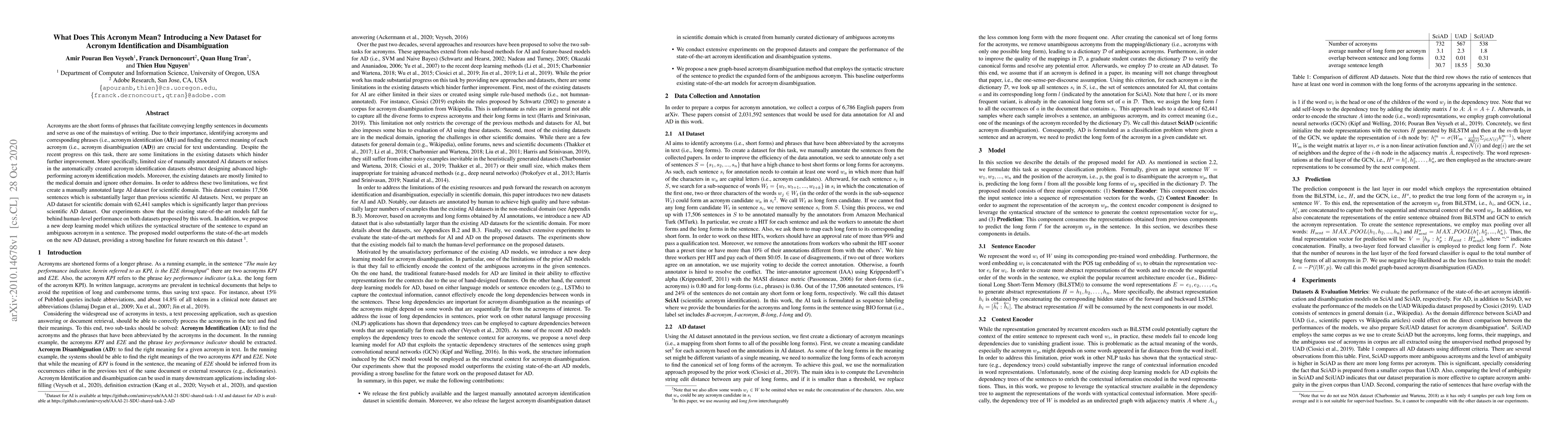 Acronyms are the short forms of phrases that facilitate conveying lengthy sentences in documents and serve as one of the mainstays of writing. Due to their importance, identifying acronyms and corresponding phrases (i.e., acronym identification (AI)) and finding the correct meaning of each acronym (i.e., acronym disambiguation (AD)) are crucial for text understanding. Despite the recent progress on this task, there are some limitations in the existing datasets which hinder further improvement. More specifically, limited size of manually annotated AI datasets or noises in the automatically created acronym identification datasets obstruct designing advanced high-performing acronym identification models. Moreover, the existing datasets are mostly limited to the medical domain and ignore other domains. In order to address these two limitations, we first create a manually annotated large AI dataset for scientific domain. This dataset contains 17,506 sentences which is substantially larger than previous scientific AI datasets. Next, we prepare an AD dataset for scientific domain with 62,441 samples which is significantly larger than the previous scientific AD dataset. Our experiments show that the existing state-of-the-art models fall far behind human-level performance on both datasets proposed by this work. In addition, we propose a new deep learning model that utilizes the syntactical structure of the sentence to expand an ambiguous acronym in a sentence. The proposed model outperforms the state-of-the-art models on the new AD dataset, providing a strong baseline for future research on this dataset.