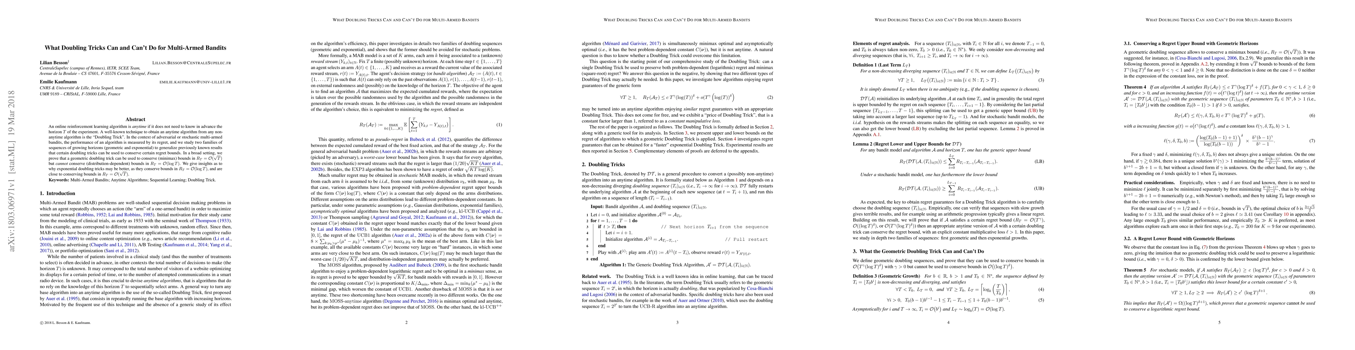 An online reinforcement learning algorithm is anytime if it does not need to know in advance the horizon T of the experiment. A well-known technique to obtain an anytime algorithm from any non-anytime algorithm is the "Doubling Trick". In the context of adversarial or stochastic multi-armed bandits, the performance of an algorithm is measured by its regret, and we study two families of sequences of growing horizons (geometric and exponential) to generalize previously known results that certain doubling tricks can be used to conserve certain regret bounds. In a broad setting, we prove that a geometric doubling trick can be used to conserve (minimax) bounds in $R\_T = O(\sqrt{T})$ but cannot conserve (distribution-dependent) bounds in $R\_T = O(\log T)$. We give insights as to why exponential doubling tricks may be better, as they conserve bounds in $R\_T = O(\log T)$, and are close to conserving bounds in $R\_T = O(\sqrt{T})$.