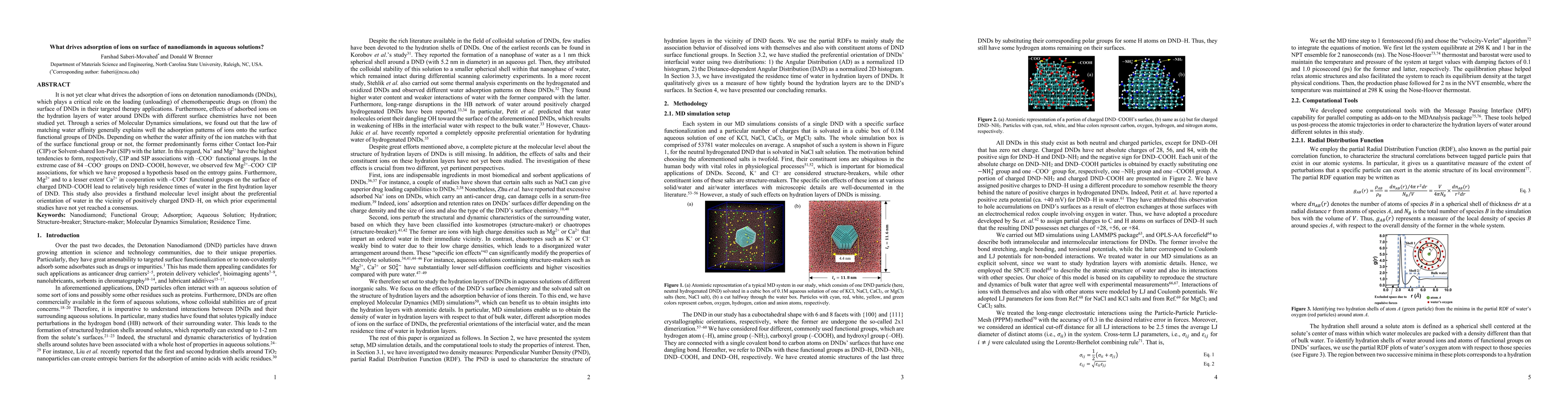 This study uses Molecular Dynamics simulations to determine that the adsorption of ions on detonation nanodiamonds (DNDs) in aqueous solutions is primarily driven by the law of matching water affinity, leading to either Contact Ion-Pair or Solvent-shared Ion-Pair formations. The findings suggest that Na$^+$ and Mg$^{2+}$ form CIP and SIP with COO$^-$ groups, respectively, with Mg$^{2+}$ also influencing water hydration layers.
