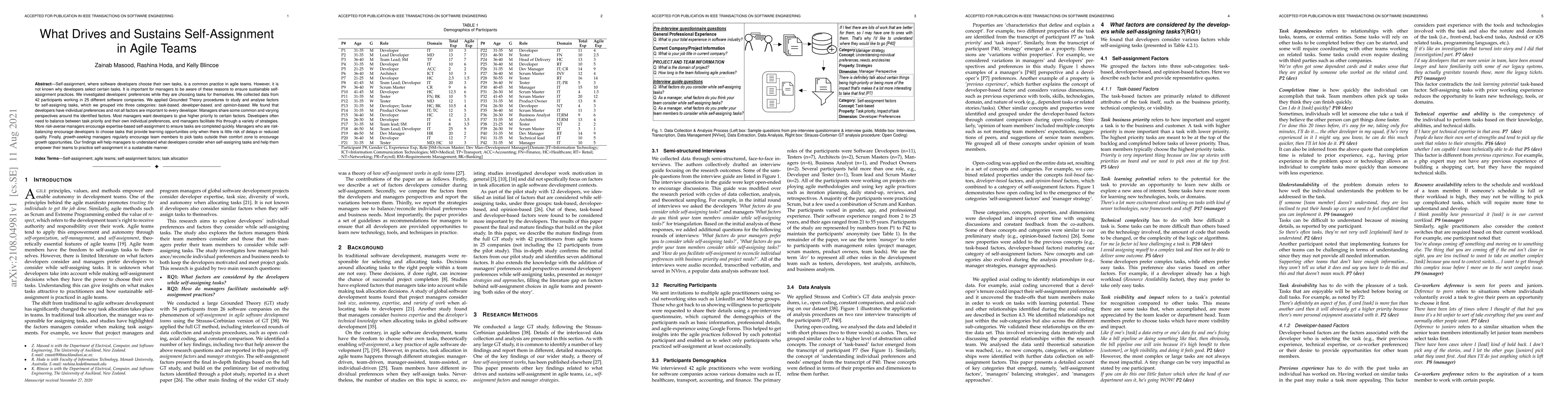 Researchers studied why software developers choose tasks in agile teams, finding that individual preferences and task priorities play a role, with managers' strategies influencing self-assignment practices.