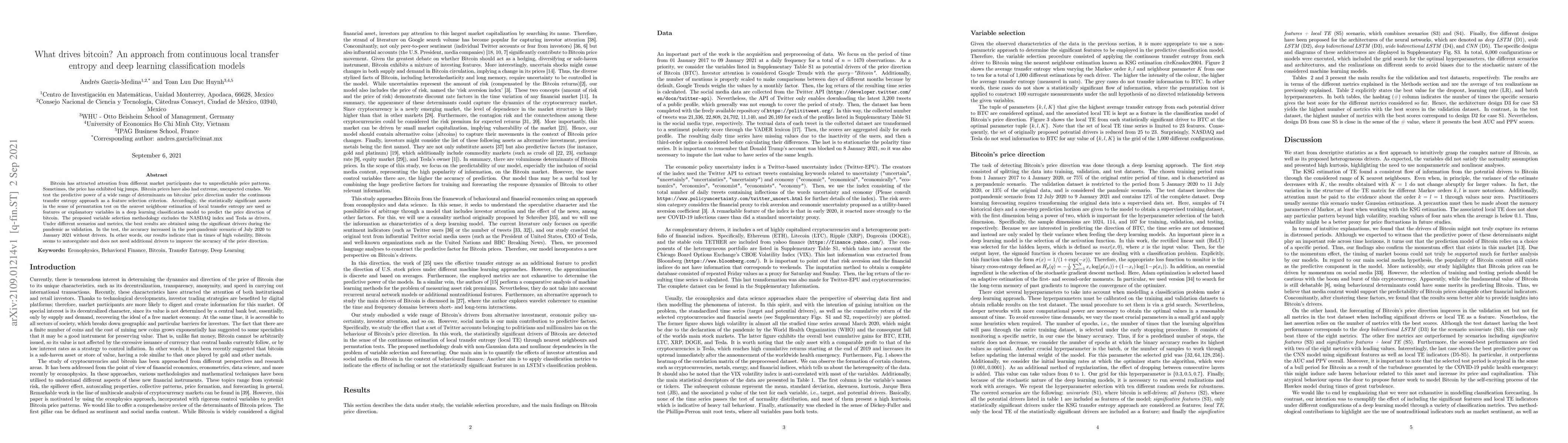 Bitcoin has attracted attention from different market participants due to unpredictable price patterns. Sometimes, the price has exhibited big jumps. Bitcoin prices have also had extreme, unexpected crashes. We test the predictive power of a wide range of determinants on bitcoins' price direction under the continuous transfer entropy approach as a feature selection criterion. Accordingly, the statistically significant assets in the sense of permutation test on the nearest neighbour estimation of local transfer entropy are used as features or explanatory variables in a deep learning classification model to predict the price direction of bitcoin. The proposed variable selection methodology excludes the NASDAQ index and Tesla as drivers. Under different scenarios and metrics, the best results are obtained using the significant drivers during the pandemic as validation. In the test, the accuracy increased in the post-pandemic scenario of July 2020 to January 2021 without drivers. In other words, our results indicate that in times of high volatility, Bitcoin seems to autoregulate and does not need additional drivers to improve the accuracy of the price direction.