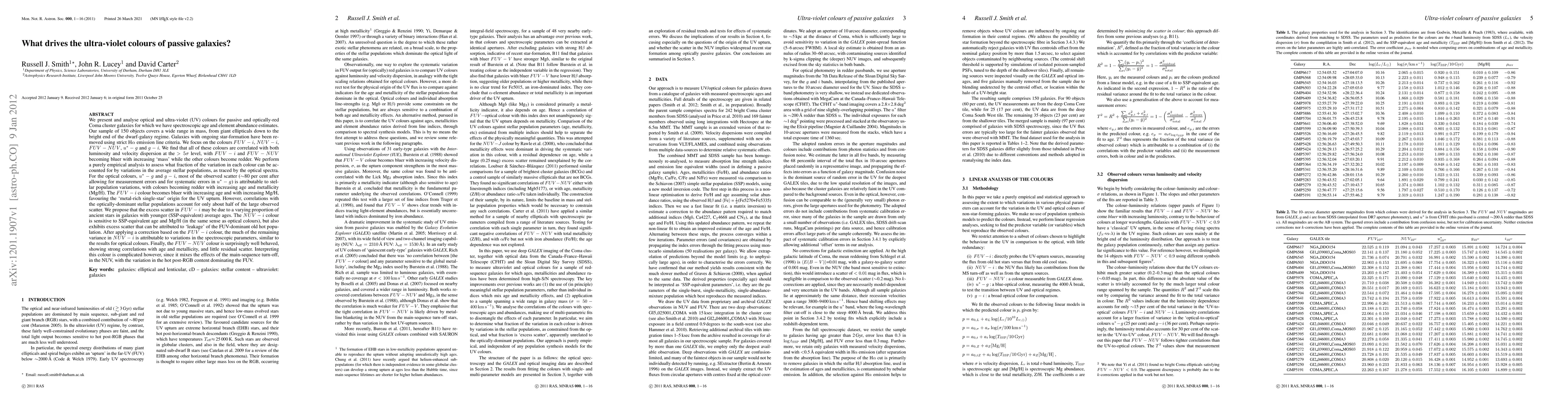 We present and analyse optical and ultra-violet colours for passive and optically-red Coma cluster galaxies for which we have spectroscopic age and element abundance estimates. Our sample of 150 objects covers a wide range in mass, from giant ellipticals to the bright end of the dwarf-galaxy regime. We focus on the colours FUV-i, NUV-i, FUV-NUV, u*-g and g-i. We find that all of these colours are correlated with both luminosity and velocity dispersion at the >5 sigma level, with FUV-i and FUV-NUV becoming bluer with increasing `mass' while the other colours become redder. We perform an empirical analysis to assess what fraction of the variation in each colour can be accounted for by variations in the average stellar populations, as traced by the optical spectra. For u*-g and g-i, most of the observed scatter (~80% after allowing for measurement errors and for systematic errors in u*-g) is attributable to stellar population variations, with colours becoming redder with increasing age and metallicity (Mg/H). The FUV-i colour becomes bluer with increasing age and with increasing Mg/H, favouring a `metal-rich single-star' origin for the UV upturn. However, correlations with the optically-dominant stellar populations account for only about half of the large observed scatter. We propose that the excess scatter in FUV-i may be due to a varying proportion of ancient stars in galaxies with younger average ages. The NUV-i colour is sensitive to age and Mg/H, but exhibits excess scatter that can be attributed to `leakage' of the FUV upturn. Applying a correction based on the FUV-i colour we account for ~80% of the variance in NUV-i, as for the optical colours. The FUV-NUV colour shows strong correlations with age and Mg/H, and little residual scatter. Interpreting this colour is complicated however, since it mixes the effects from the main-sequence turn-off with those from the hot evolved stars.