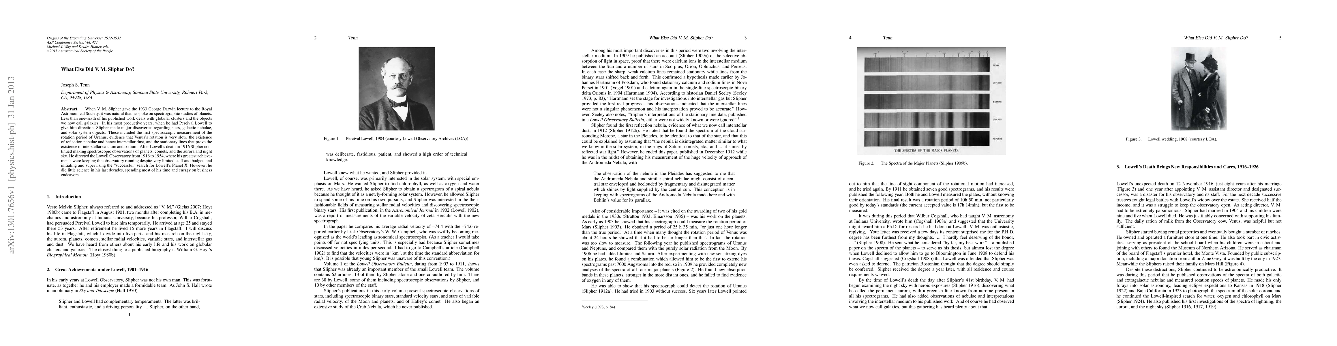 When V. M. Slipher gave the 1933 George Darwin lecture to the Royal Astronomical Society, it was natural that he spoke on spectrographic studies of planets. Less than one-sixth of his published work deals with globular clusters and the objects we now call galaxies. In his most productive years, when he had Percival Lowell to give him direction, Slipher made major discoveries regarding stars, galactic nebulae, and solar system objects. These included the first spectroscopic measurement of the rotation period of Uranus, evidence that Venus's rotation is very slow, the existence of reflection nebulae and hence interstellar dust, and the stationary lines that prove the existence of interstellar calcium and sodium. After Lowell's death in 1916 Slipher continued making spectroscopic observations of planets, comets, and the aurora and night sky. He directed the Lowell Observatory from 1916 to 1954, where his greatest achievements were keeping the observatory running despite very limited staff and budget, and initiating and supervising the "successful" search for Lowell's Planet X. However, he did little science in his last decades, spending most of his time and energy on business endeavors.