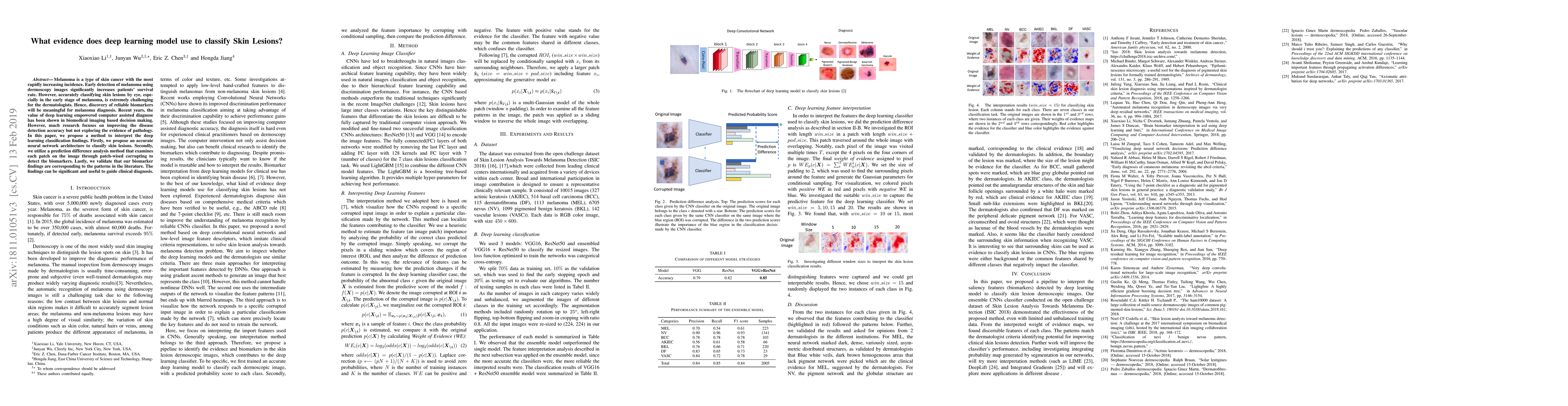 Melanoma is a type of skin cancer with the most rapidly increasing incidence. Early detection of melanoma using dermoscopy images significantly increases patients' survival rate. However, accurately classifying skin lesions by eye, especially in the early stage of melanoma, is extremely challenging for the dermatologists. Hence, the discovery of reliable biomarkers will be meaningful for melanoma diagnosis. Recent years, the value of deep learning empowered computer-assisted diagnose has been shown in biomedical imaging based decision making. However, much research focuses on improving disease detection accuracy but not exploring the evidence of pathology. In this paper, we propose a method to interpret the deep learning classification findings. Firstly, we propose an accurate neural network architecture to classify skin lesions. Secondly, we utilize a prediction difference analysis method that examines each patch on the image through patch-wised corrupting to detect the biomarkers. Lastly, we validate that our biomarker findings are corresponding to the patterns in the literature. The findings can be significant and useful to guide clinical diagnosis.