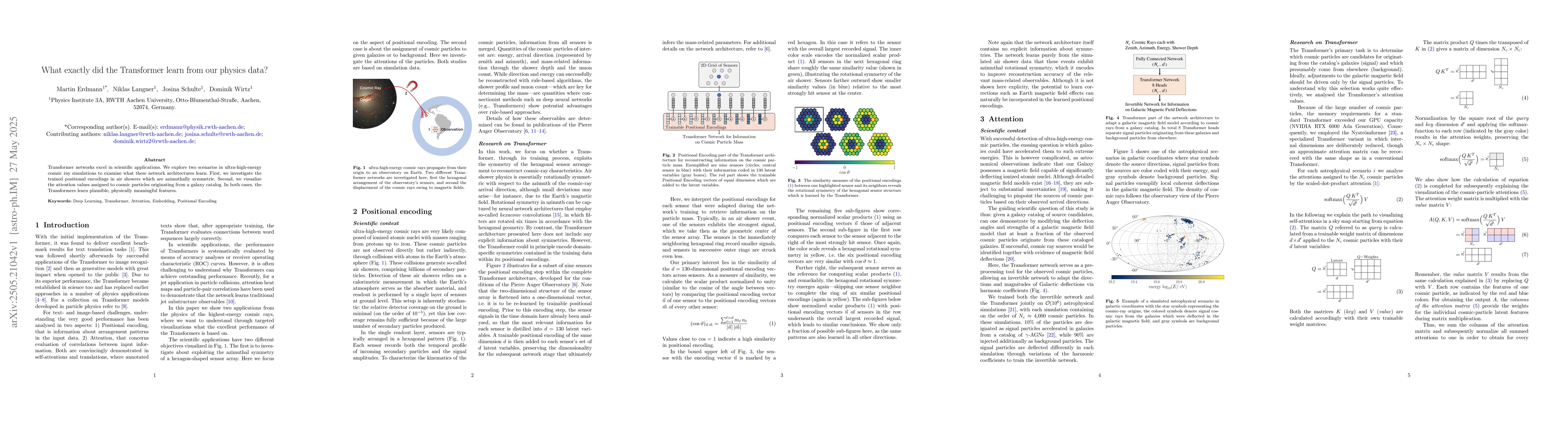 Transformer networks excel in scientific applications. We explore two scenarios in ultra-high-energy cosmic ray simulations to examine what these network architectures learn. First, we investigate the trained positional encodings in air showers which are azimuthally symmetric. Second, we visualize the attention values assigned to cosmic particles originating from a galaxy catalog. In both cases, the Transformers learn plausible, physically meaningful features.