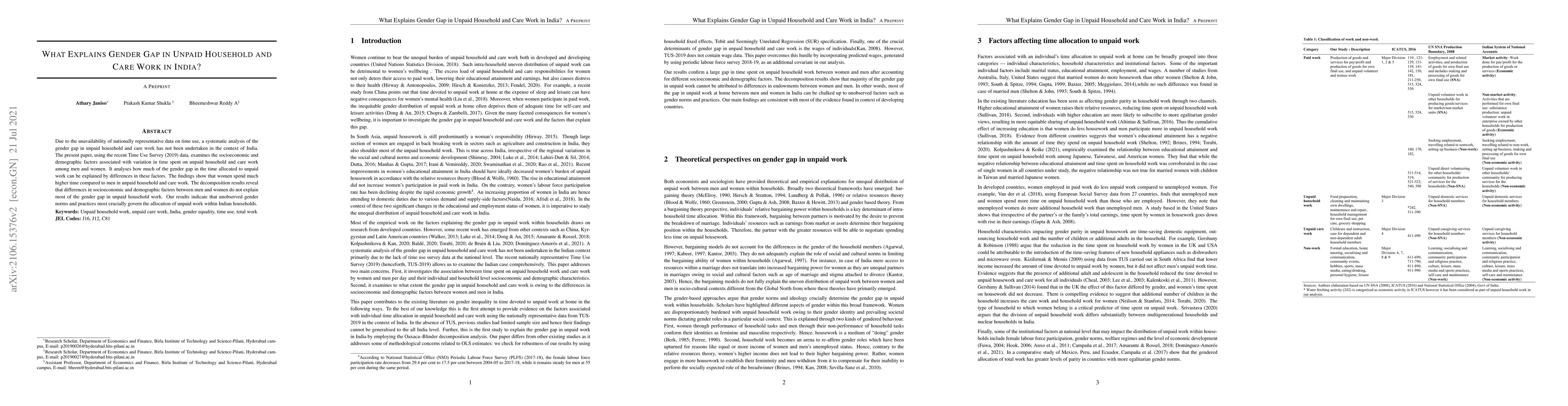 This paper analyzes the gender gap in unpaid household and care work in India using recent Time Use Survey data, revealing that women spend significantly more time on such tasks than men. The study finds that socioeconomic and demographic factors do not account for most of the gender gap, suggesting that unobserved gender norms and practices are the primary determinants.