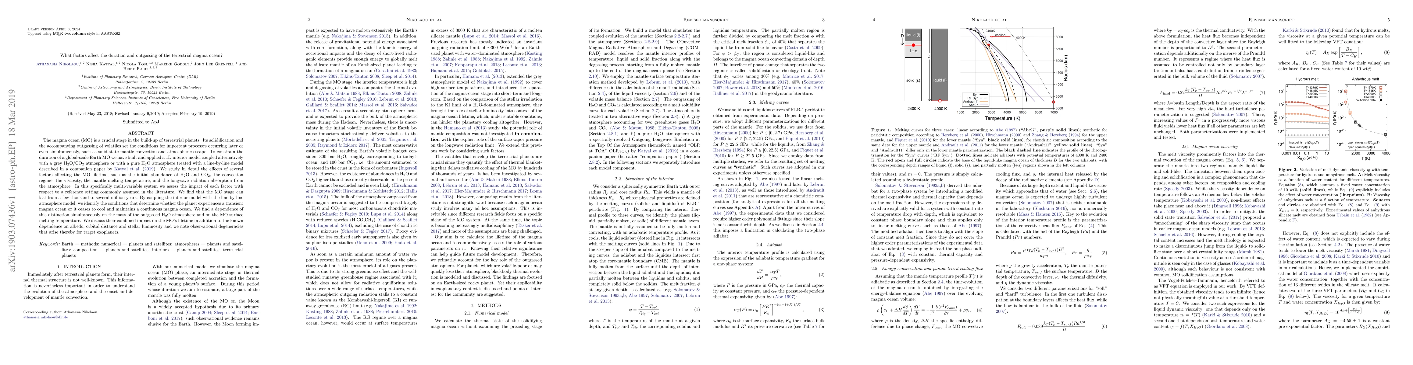 This paper investigates factors influencing the duration and outgassing of Earth's magma ocean, using a 1D interior model coupled with atmospheric models. It finds that the magma ocean's lifetime ranges from a few thousand to several million years, depending on initial volatile abundances, convection regime, viscosity, and atmospheric absorption, with significant implications for planetary evolution and atmospheric escape.