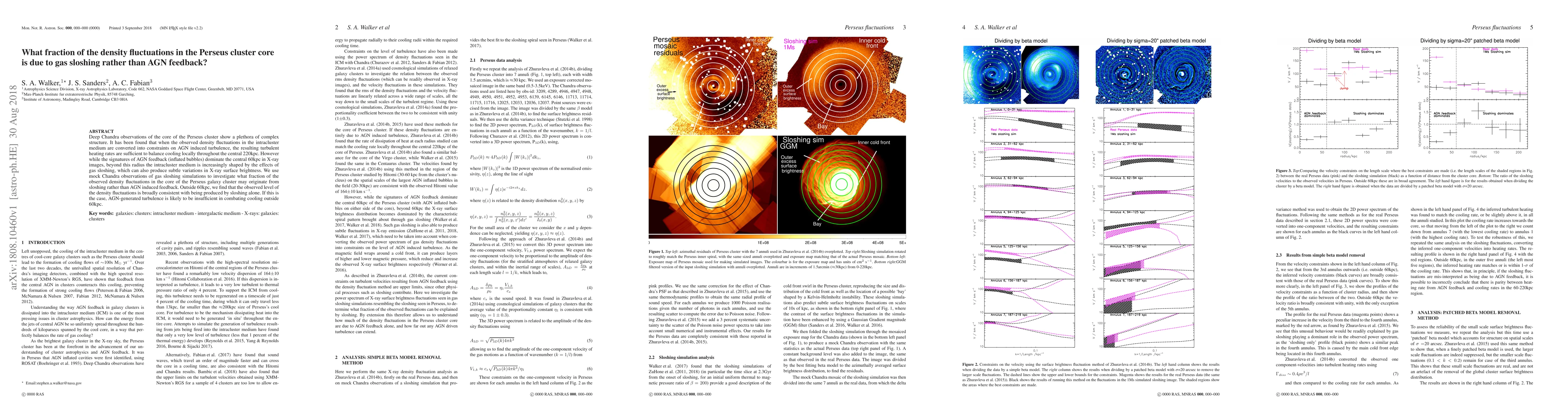 Deep Chandra observations of the core of the Perseus cluster show a plethora of complex structure. It has been found that when the observed density fluctuations in the intracluster medium are converted into constraints on AGN induced turbulence, the resulting turbulent heating rates are sufficient to balance cooling locally throughout the central 220kpc. However while the signatures of AGN feedback (inflated bubbles) dominate the central 60kpc in X-ray images, beyond this radius the intracluster medium is increasingly shaped by the effects of gas sloshing, which can also produce subtle variations in X-ray surface brightness. We use mock Chandra observations of gas sloshing simulations to investigate what fraction of the observed density fluctuations in the core of the Perseus galaxy cluster may originate from sloshing rather than AGN induced feedback. Outside 60kpc, we find that the observed level of the density fluctuations is broadly consistent with being produced by sloshing alone. If this is the case, AGN-generated turbulence is likely to be insufficient in combating cooling outside 60kpc.