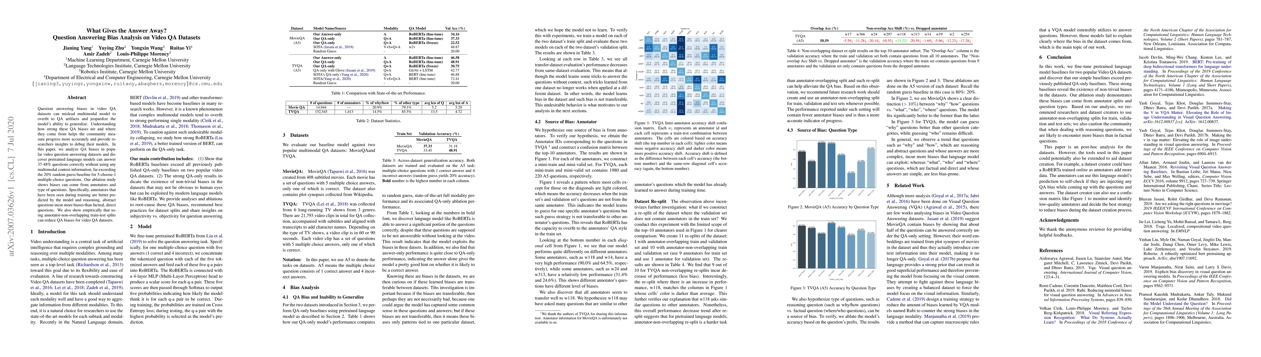 This paper analyzes biases in popular video question answering (QA) datasets, finding that pretrained language models can answer 37-48% of questions correctly without multimodal context, far exceeding the random baseline. The study reveals that biases stem from annotators and question types, with annotator-non-overlapping splits reducing these biases.