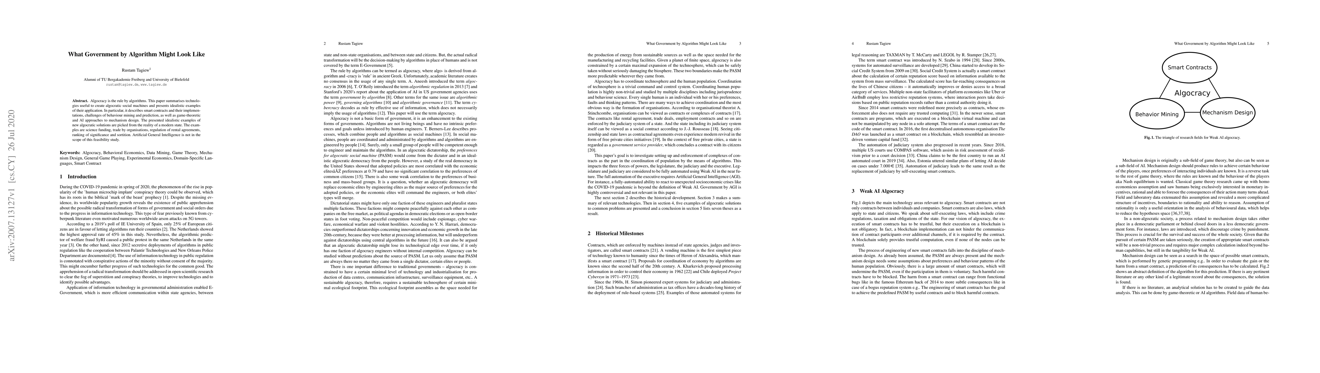 Algocracy is the rule by algorithms. This paper summarises technologies useful to create algocratic social machines and presents idealistic examples of their application. In particular, it describes smart contracts and their implementations, challenges of behaviour mining and prediction, as well as game-theoretic and AI approaches to mechanism design. The presented idealistic examples of new algocratic solutions are picked from the reality of a modern state. The examples are science funding, trade by organisations, regulation of rental agreements, ranking of significance and sortition. Artificial General Intelligence is not in the scope of this feasibility study.