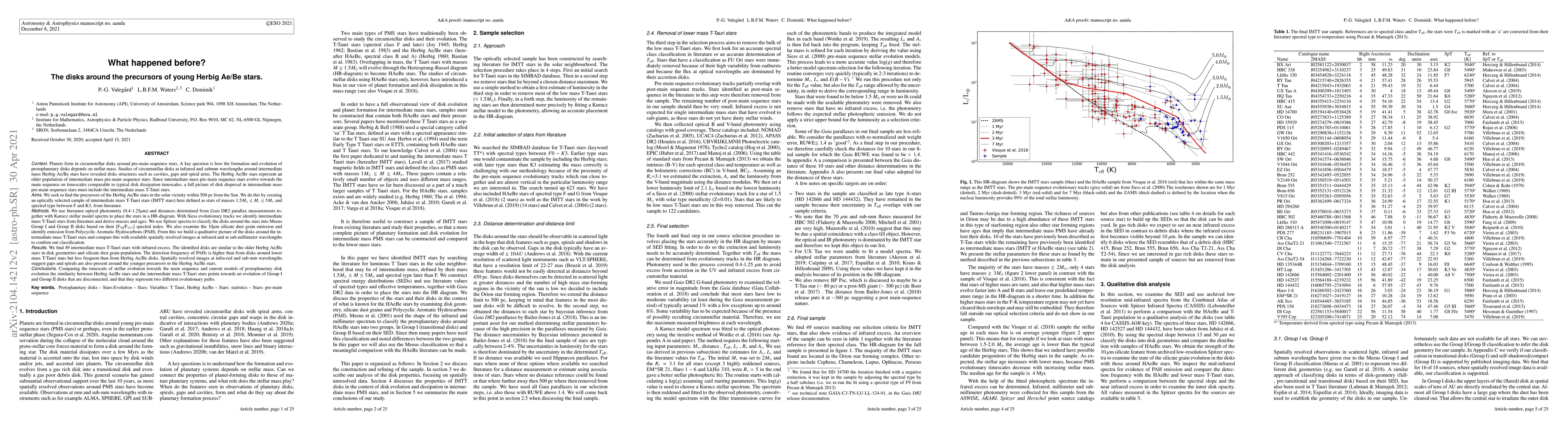 We seek to find the precursors of the Herbig Ae/Be stars in the solar vicinity within 500 pc from the Sun. We do this by creating an optically selected sample of intermediate mass T-Tauri stars (IMTT stars) here defined as stars of masses $1.5 M_{\odot}\leq M_* \leq 5 M_{\odot}$ and spectral type between F and K3, from literature. We use literature optical photometry (0.4-1.25$\mu$m) and distances determined from Gaia DR2 parallax measurements together with Kurucz stellar model spectra to place the stars in a HR-diagram. With Siess evolutionary tracks we identify intermediate mass T-Tauri stars from literature and derive masses and ages. We use Spitzer spectra to classify the disks around the stars into Meeus Group I and Group II disks based on their [F$_{30}$/F$_{13.5}$] spectral index. We also examine the 10$\mu$m silicate dust grain emission and identify emission from Polycyclic Aromatic Hydrocarbons (PAH). From this we build a qualitative picture of the disks around the intermediate mass T-Tauri stars and compare this with available spatially resolved images at infrared and at sub-millimeter wavelengths to confirm our classification. We find 49 intermediate mass T-Tauri stars with infrared excess. The identified disks are similar to the older Herbig Ae/Be stars in disk geometries and silicate dust grain population. Spatially resolved images at infra-red and sub-mm wavelengths suggest gaps and spirals are also present around the younger precursors to the Herbig Ae/Be stars. Comparing the timescale of stellar evolution towards the main sequence and current models of protoplanetary disk evolution the similarity between Herbig Ae/Be stars and the intermediate mass T-Tauri stars points towards an evolution of Group I and Group II disks that are disconnected, and that they represent two different evolutionary paths.