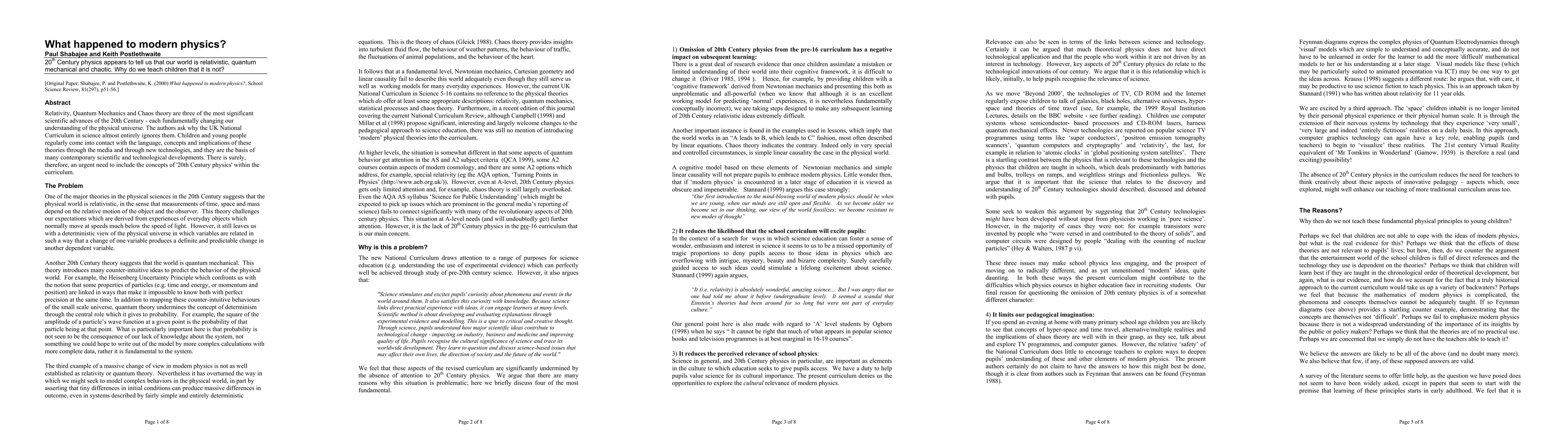 Relativity, Quantum Mechanics and Chaos theory are three of the most significant scientific advances of the 20th Century - each fundamentally changing our understanding of the physical universe. The authors ask why the UK National Curriculum in science almost entirely ignores them. Children and young people regularly come into contact with the language, concepts and implications of these theories through the media and through new technologies, and they are the basis of many contemporary scientific and technological developments. There is surely, therefore, an urgent need to include the concepts of '20th Century physics' within the curriculum.