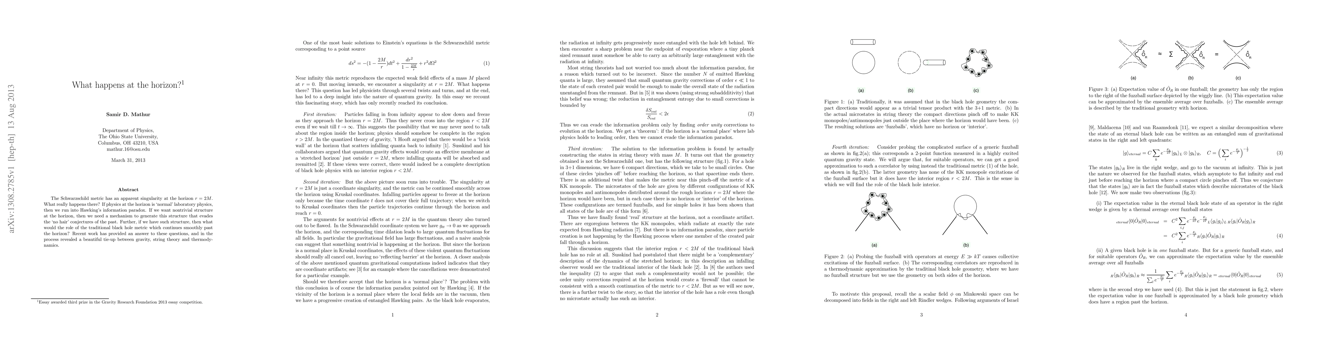 The Schwarzschild metric has an apparent singularity at the horizon r=2M. What really happens there? If physics at the horizon is 'normal' laboratory physics, then we run into Hawking's information paradox. If we want nontrivial structure at the horizon, then we need a mechanism to generate this structure that evades the 'no hair' conjectures of the past. Further, if we have such structure, then what would the role of the traditional black hole metric which continues smoothly past the horizon? Recent work has provided an answer to these questions, and in the process revealed a beautiful tie-up between gravity, string theory and thermodynamics.