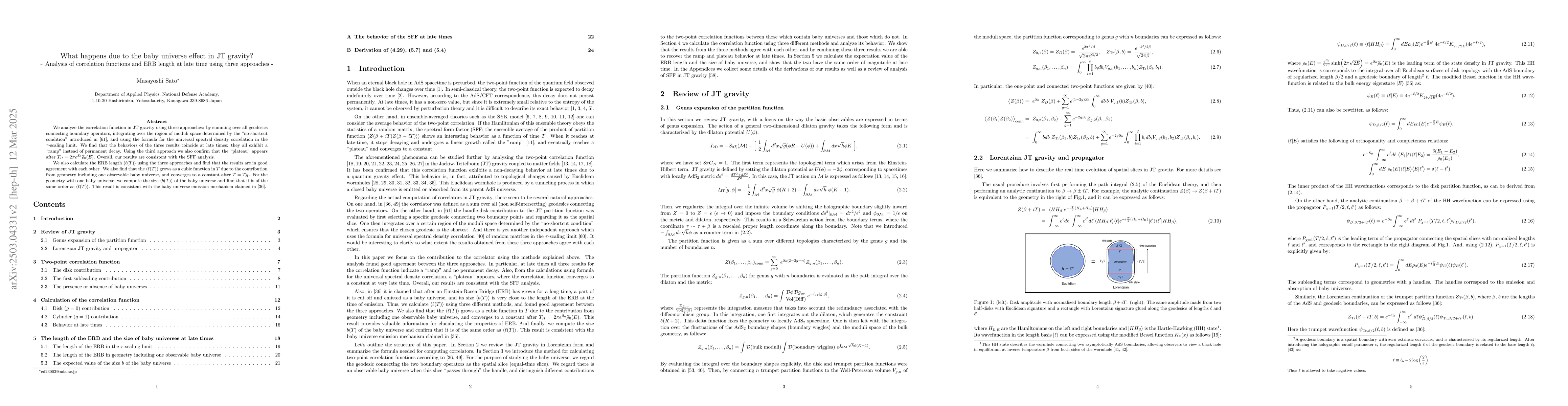 The paper presents a detailed analysis of correlation functions in JT gravity using three distinct approaches, providing a comprehensive understanding of late-time behavior and the role of baby universes.