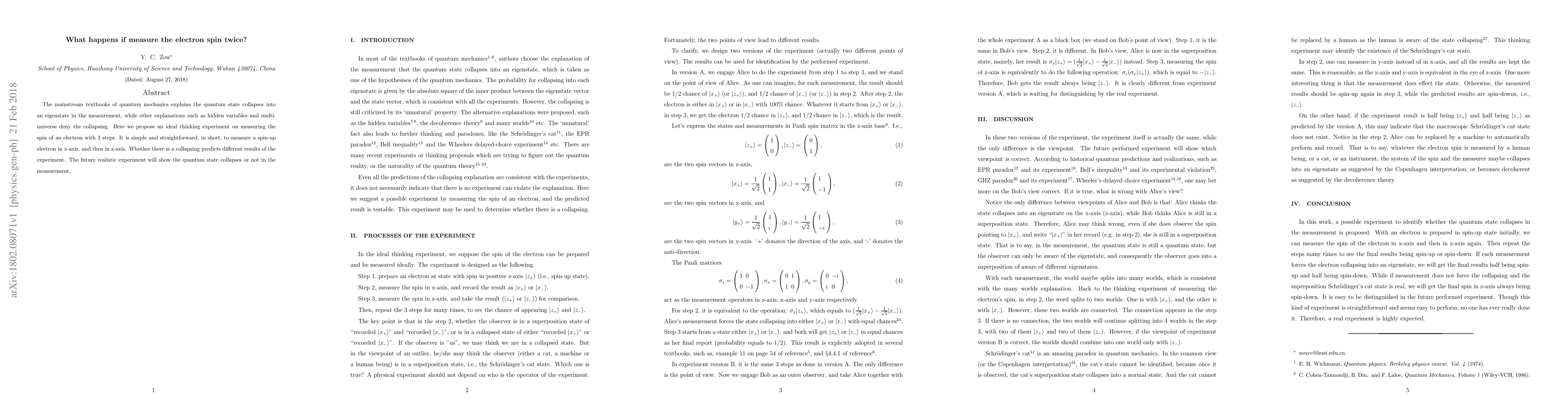 The mainstream textbooks of quantum mechanics explains the quantum state collapses into an eigenstate in the measurement, while other explanations such as hidden variables and multi-universe deny the collapsing. Here we propose an ideal thinking experiment on measuring the spin of an electron with 3 steps. It is simple and straightforward, in short, to measure a spin-up electron in x-axis, and then in z-axis. Whether there is a collapsing predicts different results of the experiment. The future realistic experiment will show the quantum state collapses or not in the measurement.