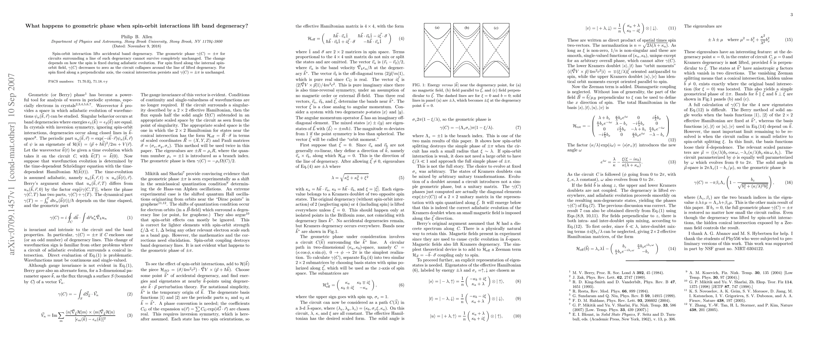 The research explores how spin-orbit interactions affect geometric phase when they lift accidental band degeneracy. The study reveals that the geometric phase u03a3(C) changes based on spin orientation during adiabatic evolution, collapsing to zero if spin is aligned with internal spin-orbit field, but persisting at u03a3(C) = u03c0 if spin is aligned perpendicular to it.