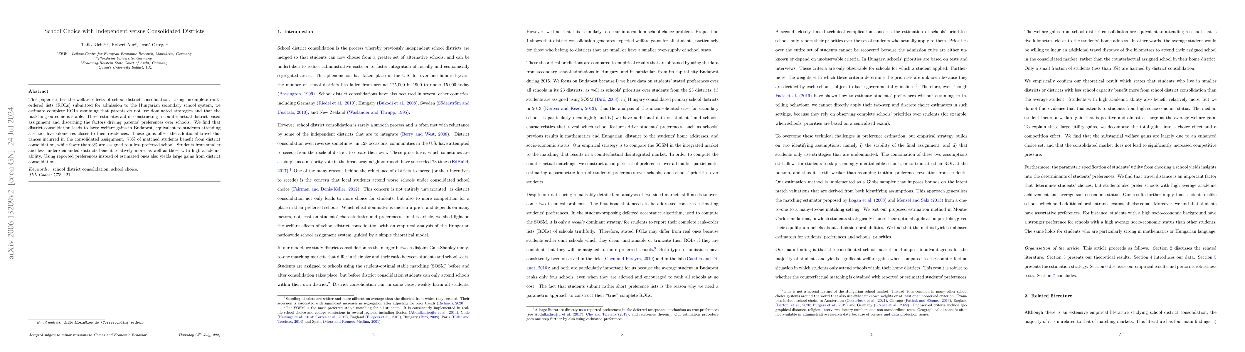 The research examines school district consolidation welfare effects, revealing worst-case welfare reductions theoretically but average gains, especially for smaller, over-demanded district students. Empirical analysis using Hungarian data shows substantial welfare gains, akin to students attending schools 5 km closer to home. The study introduces a method to estimate students' school preferences without assuming truthful reporting in the student-proposing deferred acceptance algorithm.
