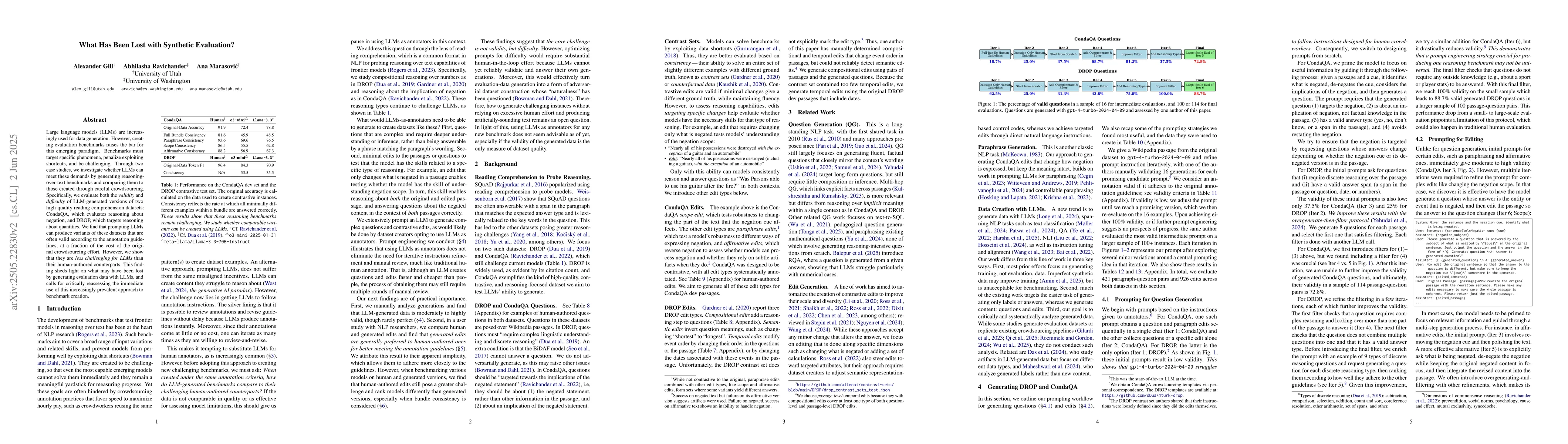 Large language models (LLMs) are increasingly used for data generation. However, creating evaluation benchmarks raises the bar for this emerging paradigm. Benchmarks must target specific phenomena, penalize exploiting shortcuts, and be challenging. Through two case studies, we investigate whether LLMs can meet these demands by generating reasoning over-text benchmarks and comparing them to those created through careful crowdsourcing. Specifically, we evaluate both the validity and difficulty of LLM-generated versions of two high-quality reading comprehension datasets: CondaQA, which evaluates reasoning about negation, and DROP, which targets reasoning about quantities. We find that prompting LLMs can produce variants of these datasets that are often valid according to the annotation guidelines, at a fraction of the cost of the original crowdsourcing effort. However, we show that they are less challenging for LLMs than their human-authored counterparts. This finding sheds light on what may have been lost by generating evaluation data with LLMs, and calls for critically reassessing the immediate use of this increasingly prevalent approach to benchmark creation.