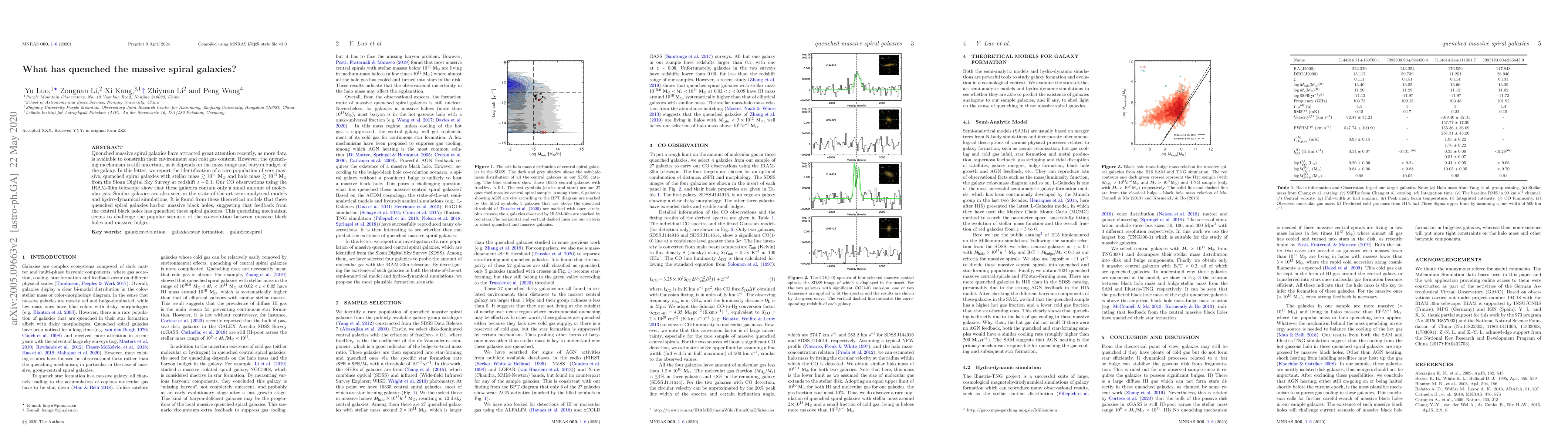 This paper identifies a rare population of very massive, quenched spiral galaxies with minimal molecular gas, suggesting that feedback from their central black holes is responsible for quenching, challenging the co-evolution scenario between black holes and massive bulges. Theoretical models support the presence of these galaxies, indicating a potential new mechanism for quenching massive spiral galaxies.