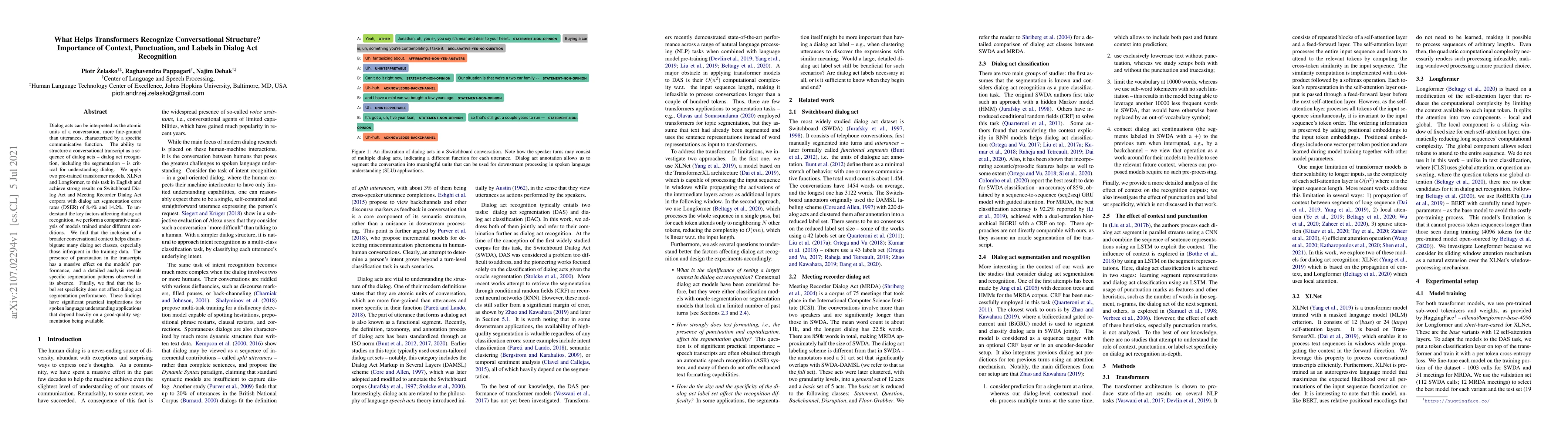Dialog acts can be interpreted as the atomic units of a conversation, more fine-grained than utterances, characterized by a specific communicative function. The ability to structure a conversational transcript as a sequence of dialog acts -- dialog act recognition, including the segmentation -- is critical for understanding dialog. We apply two pre-trained transformer models, XLNet and Longformer, to this task in English and achieve strong results on Switchboard Dialog Act and Meeting Recorder Dialog Act corpora with dialog act segmentation error rates (DSER) of 8.4% and 14.2%. To understand the key factors affecting dialog act recognition, we perform a comparative analysis of models trained under different conditions. We find that the inclusion of a broader conversational context helps disambiguate many dialog act classes, especially those infrequent in the training data. The presence of punctuation in the transcripts has a massive effect on the models' performance, and a detailed analysis reveals specific segmentation patterns observed in its absence. Finally, we find that the label set specificity does not affect dialog act segmentation performance. These findings have significant practical implications for spoken language understanding applications that depend heavily on a good-quality segmentation being available.