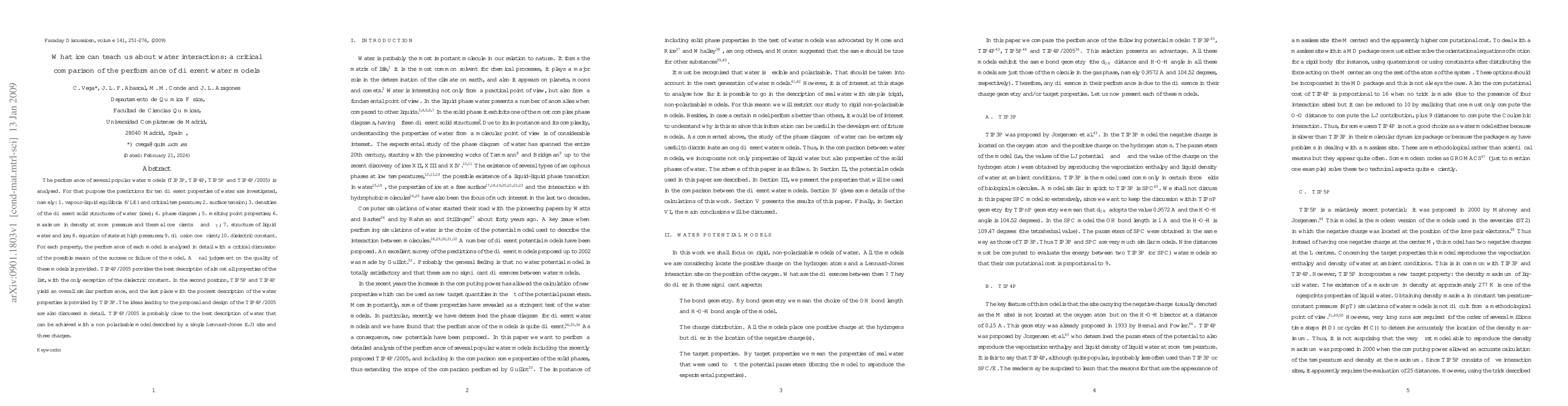 The performance of several popular water models (TIP3P, TIP4P, TIP5P and TIP4P/2005) is analysed. For that purpose the predictions for ten different properties of water are investigated, namely: 1. vapour-liquid equilibria (VLE) and critical temperature; 2. surface tension; 3. densities of the different solid structures of water (ices); 4. phase diagram; 5. melting point properties; 6. maximum in density at room pressure and thermal coefficients $\alpha$ and $\kappa_T$; 7. structure of liquid water and ice; 8. equation of state at high pressures; 9. diffusion coefficient; 10. dielectric constant. For each property, the performance of each model is analysed in detail with a critical discussion of the possible reason of the success or failure of the model. A final judgement on the quality of these models is provided. TIP4P/2005 provides the best description of almost all properties of the list, with the only exception of the dielectric constant. In the second position, TIP5P and TIP4P yield an overall similar performance, and the last place with the poorest description of the water properties is provided by TIP3P. The ideas leading to the proposal and design of the TIP4P/2005 are also discussed in detail. TIP4P/2005 is probably close to the best description of water that can be achieved with a non polarizable model described by a single Lennard-Jones (LJ) site and three charges.