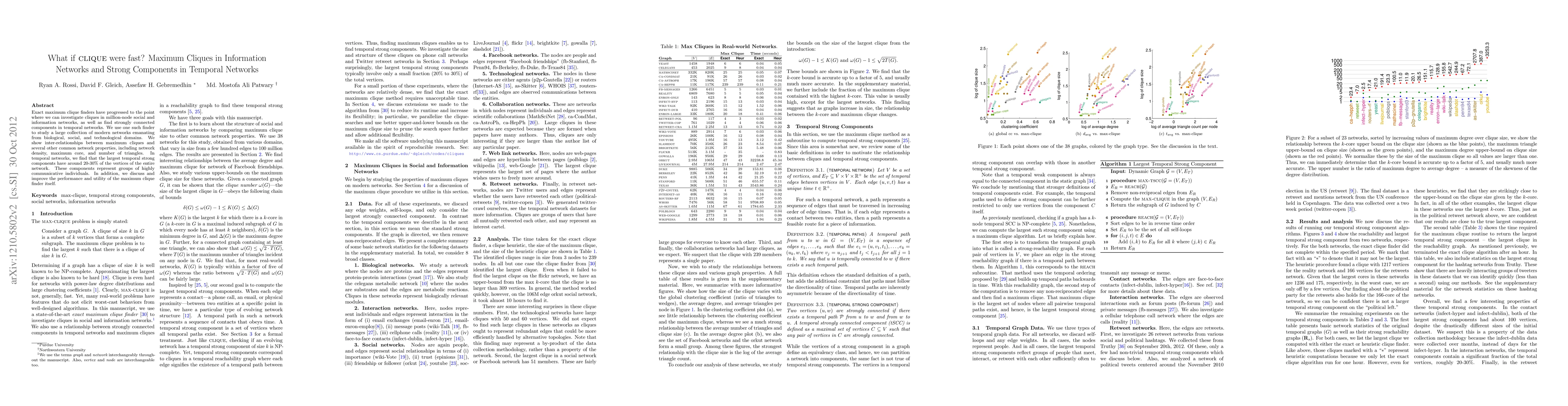 This paper explores the application of fast exact maximum clique finders to large social, biological, and technological networks, revealing inter-relationships between maximum cliques and network properties like density and triangles. It also investigates temporal networks, finding that the largest strong components contain 20-30% of the network's vertices and represent highly communicative groups.